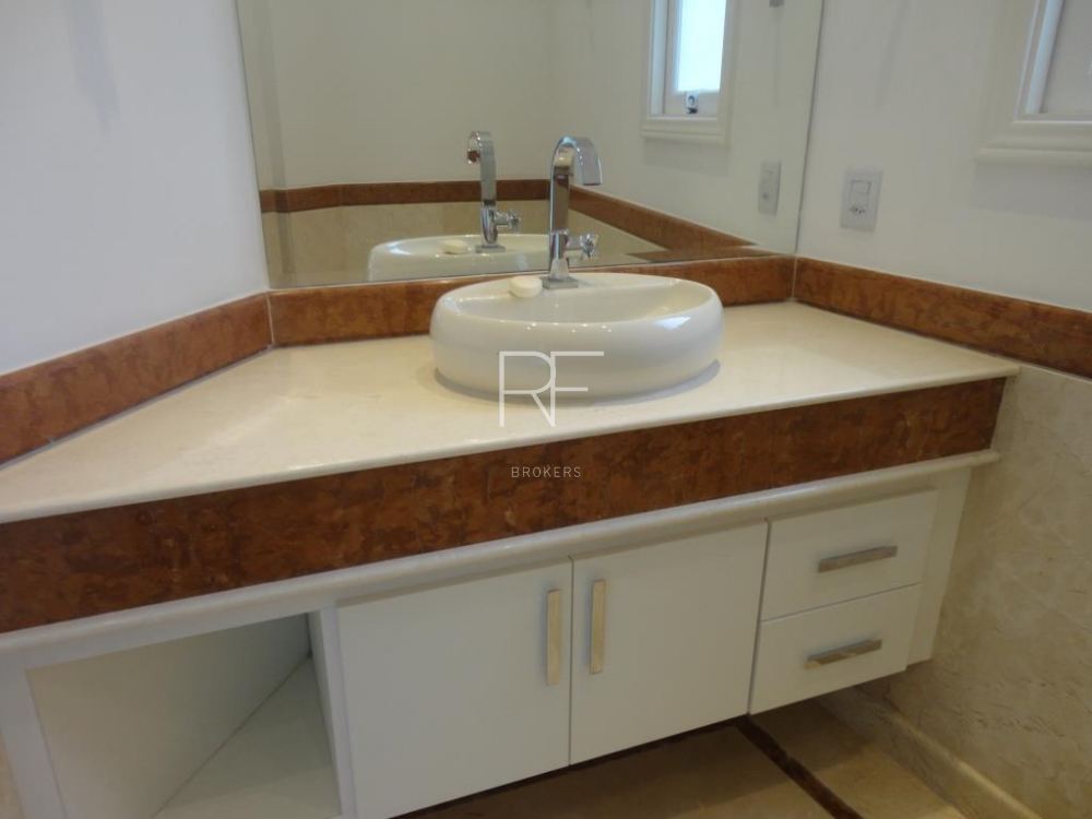 A suíte master tem banheira de hidromassagem jacuzzi, duchas. Banheiro senhor e senhora, pia dupla em mármore.