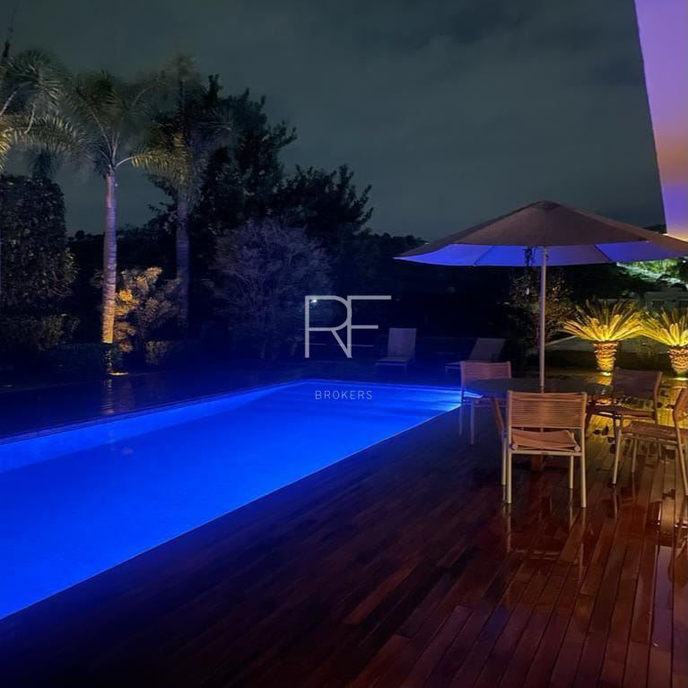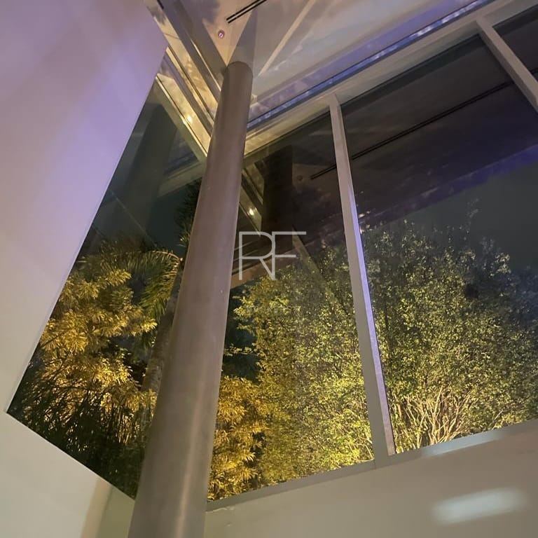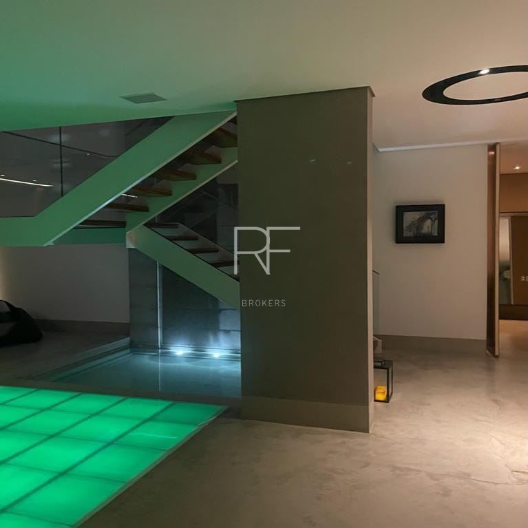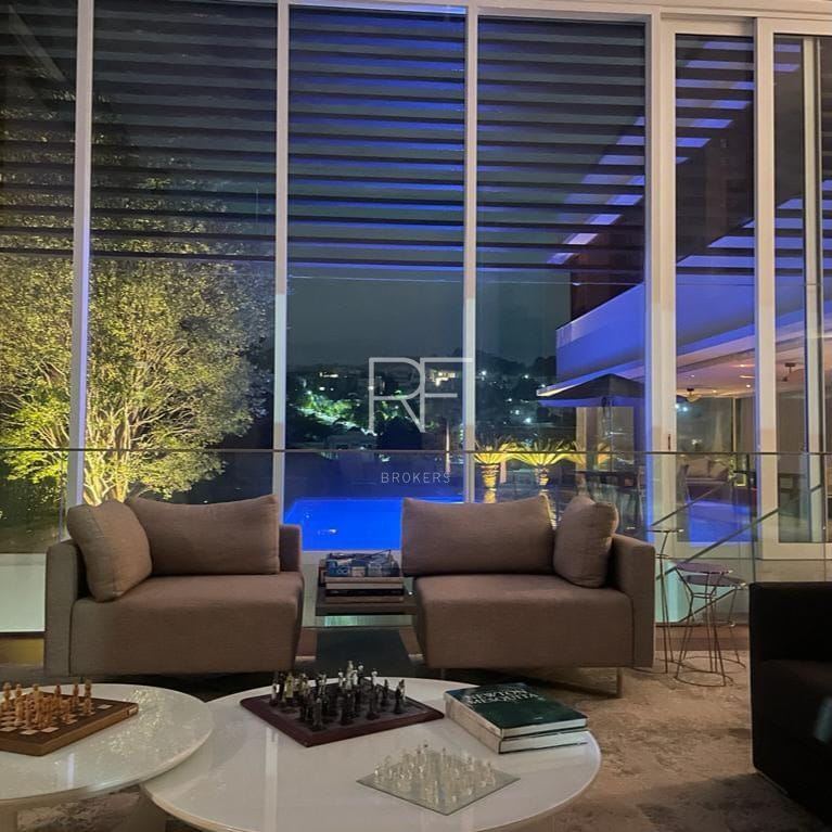 O living, distribuído em 3 ambientes com pé direito alto, é integrado à área gourmet, SPA e uma piscina aquecida. A residência também inclui um amplo escritório e sala de TV.