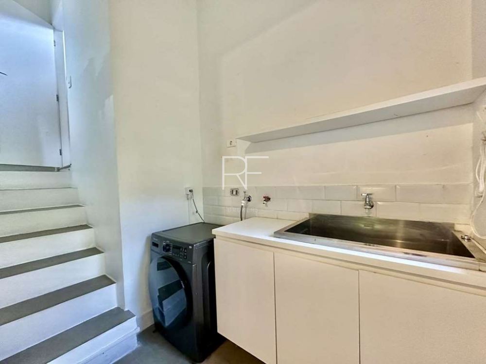 Lavanderia com tanque em inox e armários.