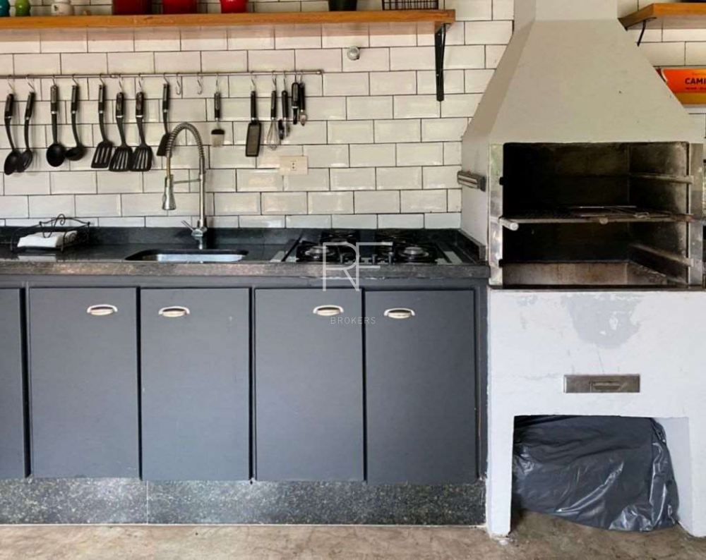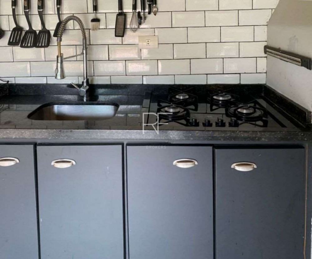 Grande salão gourmet com churrasqueira, bancada com armários, pia e fogão cooktop.