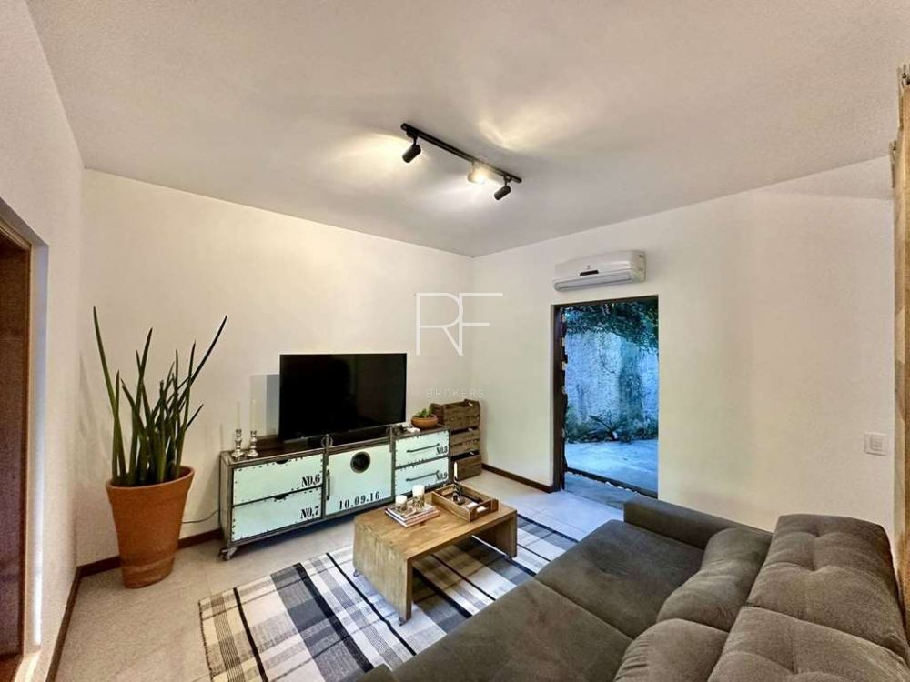 Sala de TV com ar-condicionado Q/F separada por portas de correr e varanda com pergolado.