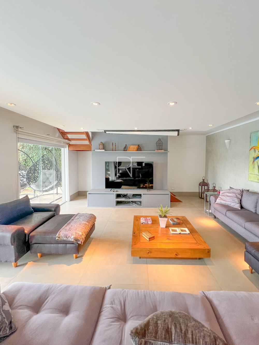 Family room com TV , banheiro próximo a área de lazer