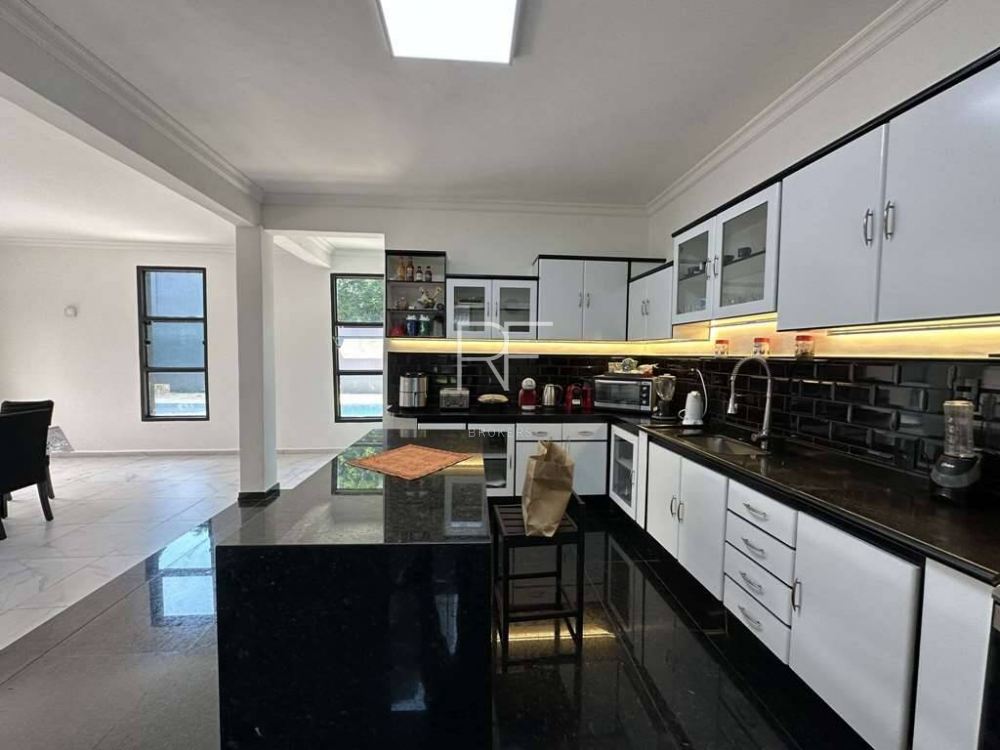 Cozinha com móveis planejados , toda em mármore e ilha central.