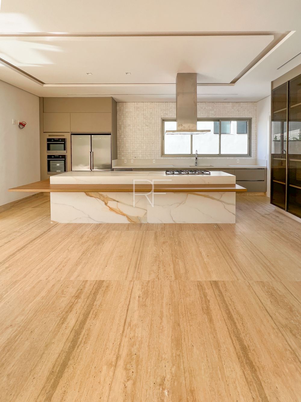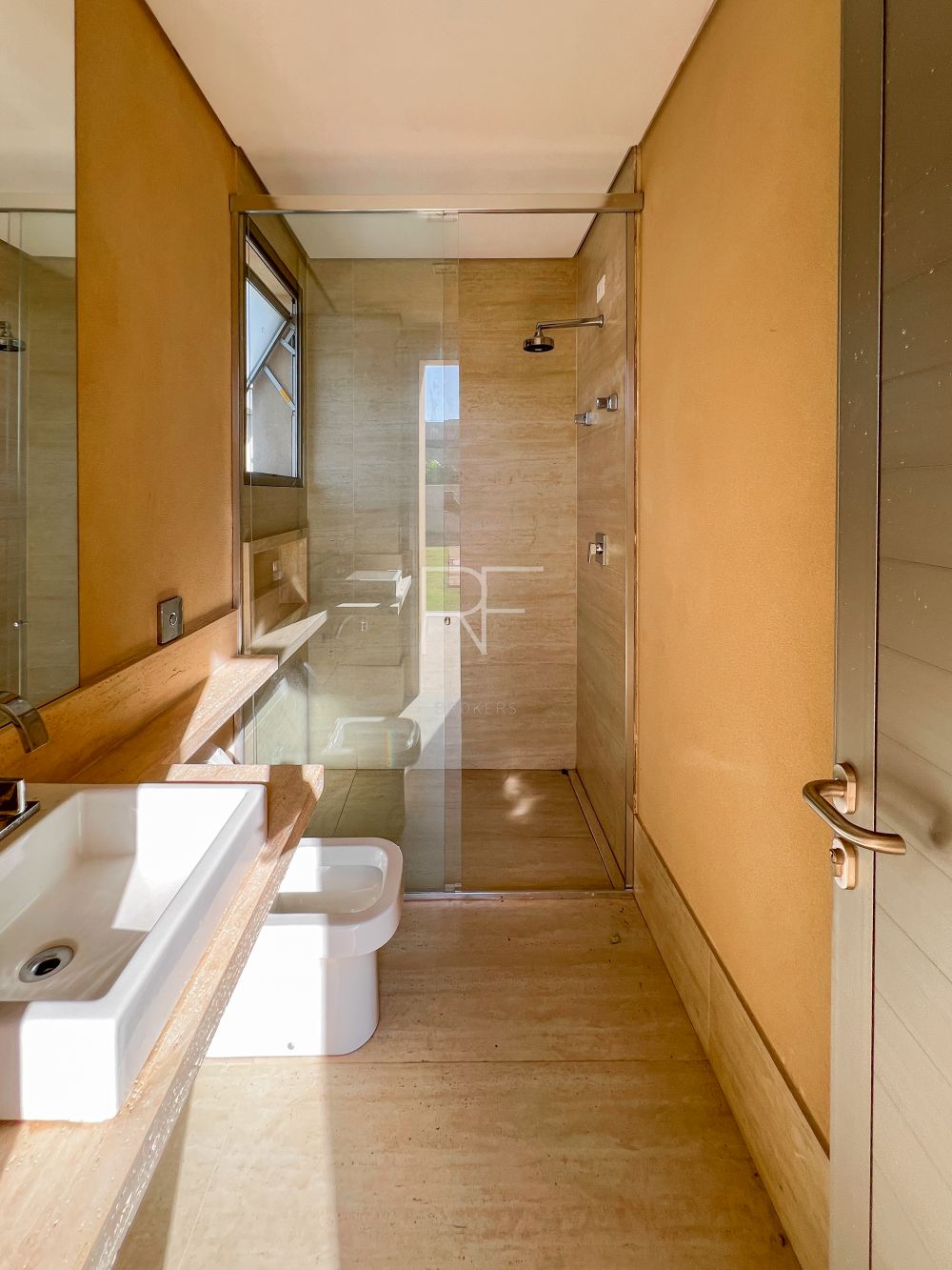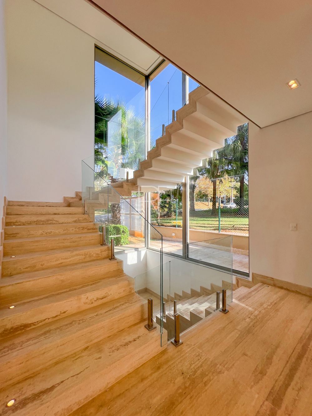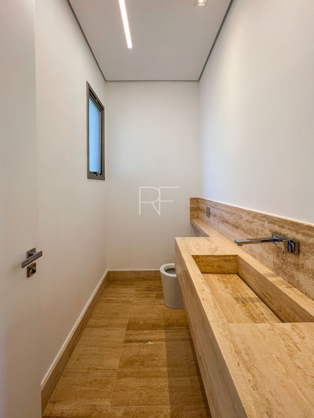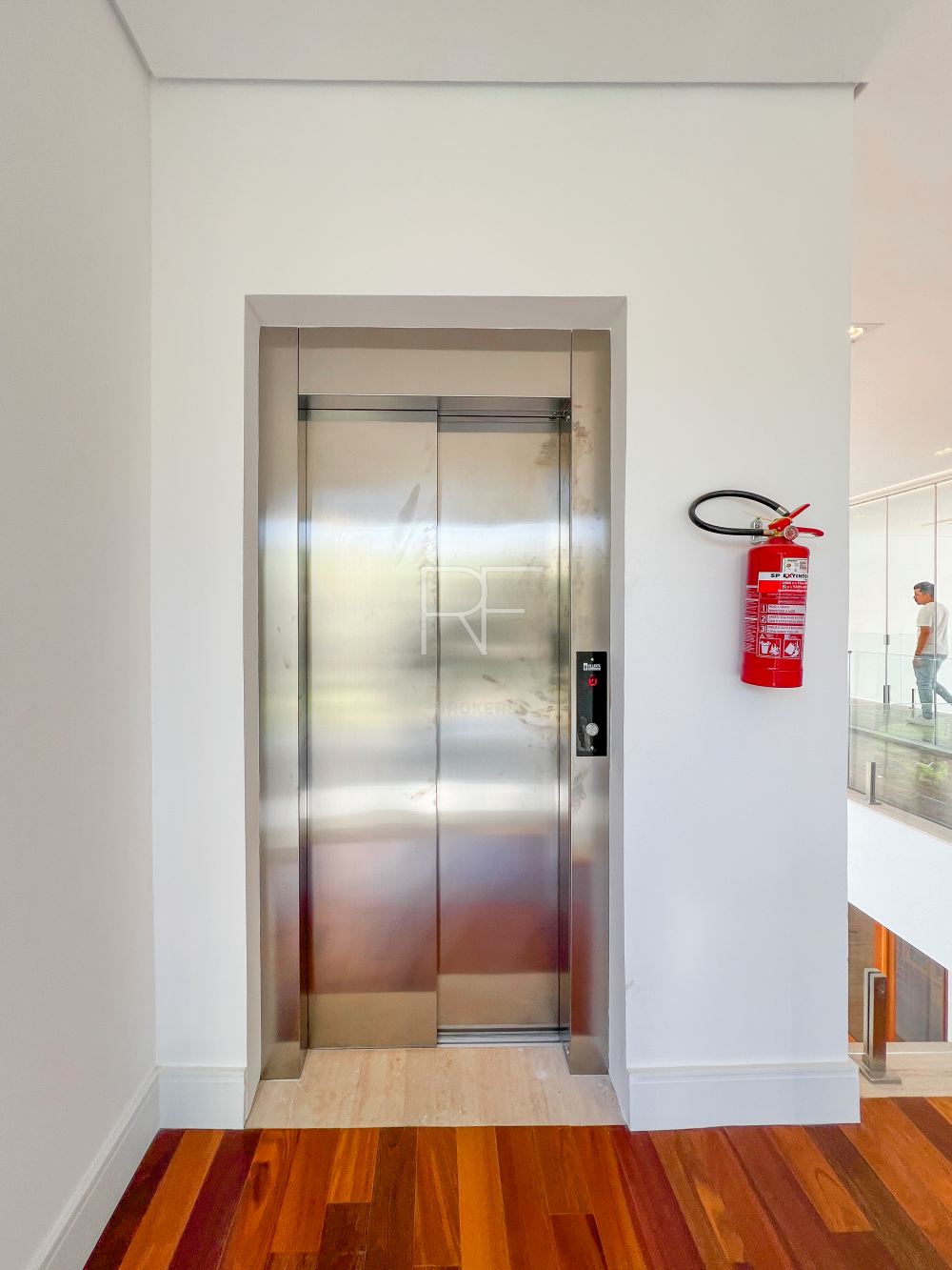* São 3 pavimentos servidos por elevador, 4 suítes sendo 1 master com Hidro Pretty Jet automatizada, bancada em QUARTZO BRANCO, 2 closets Sr. e Sra., e sala íntima. Banheiros com metais Deca, repletos de Armários. Sala íntima, Escritório, Lavabo com cuba esculpida em Mármore Travertino Navona, Área social e escada em Travertino Navona, Revestimentos Decortiles, Roca e Castelatto. Lareira em Mármore Travertino Navona Área íntima em assoalho Cumaru e Esquadrias de Alumínio linha Eurotop