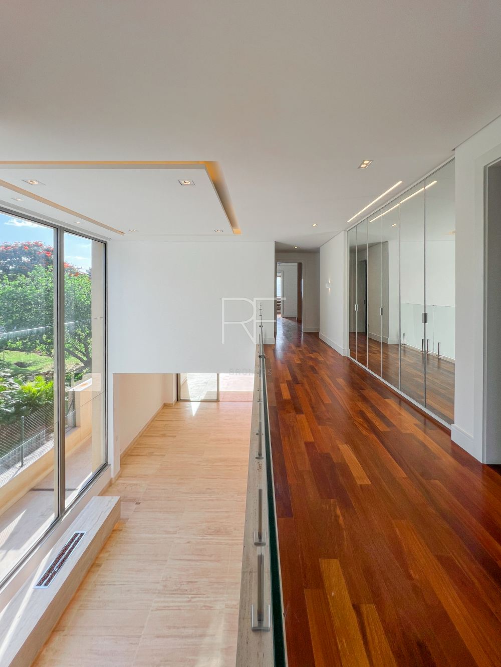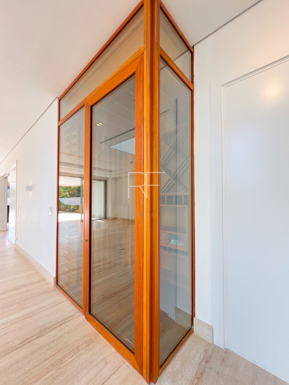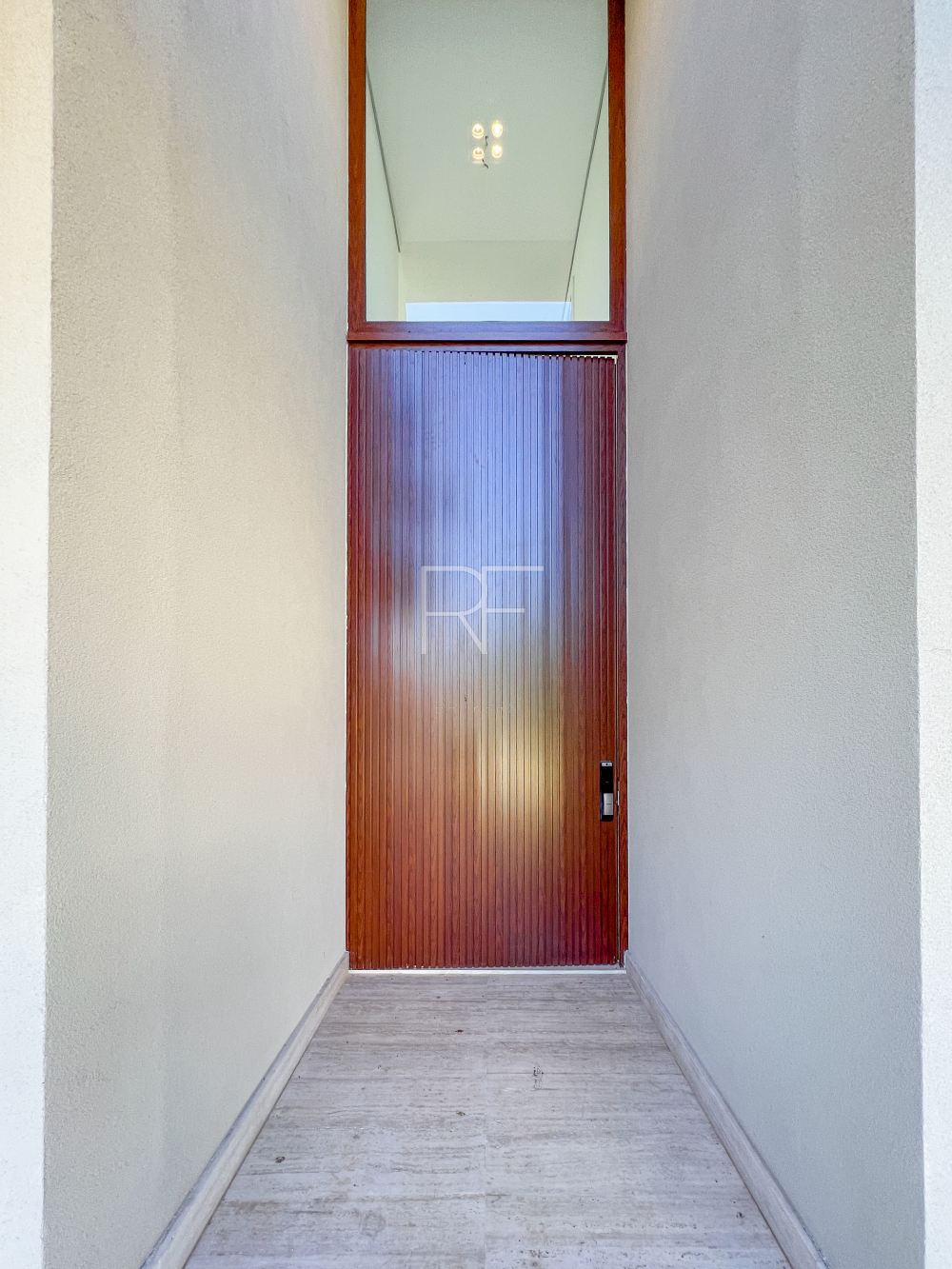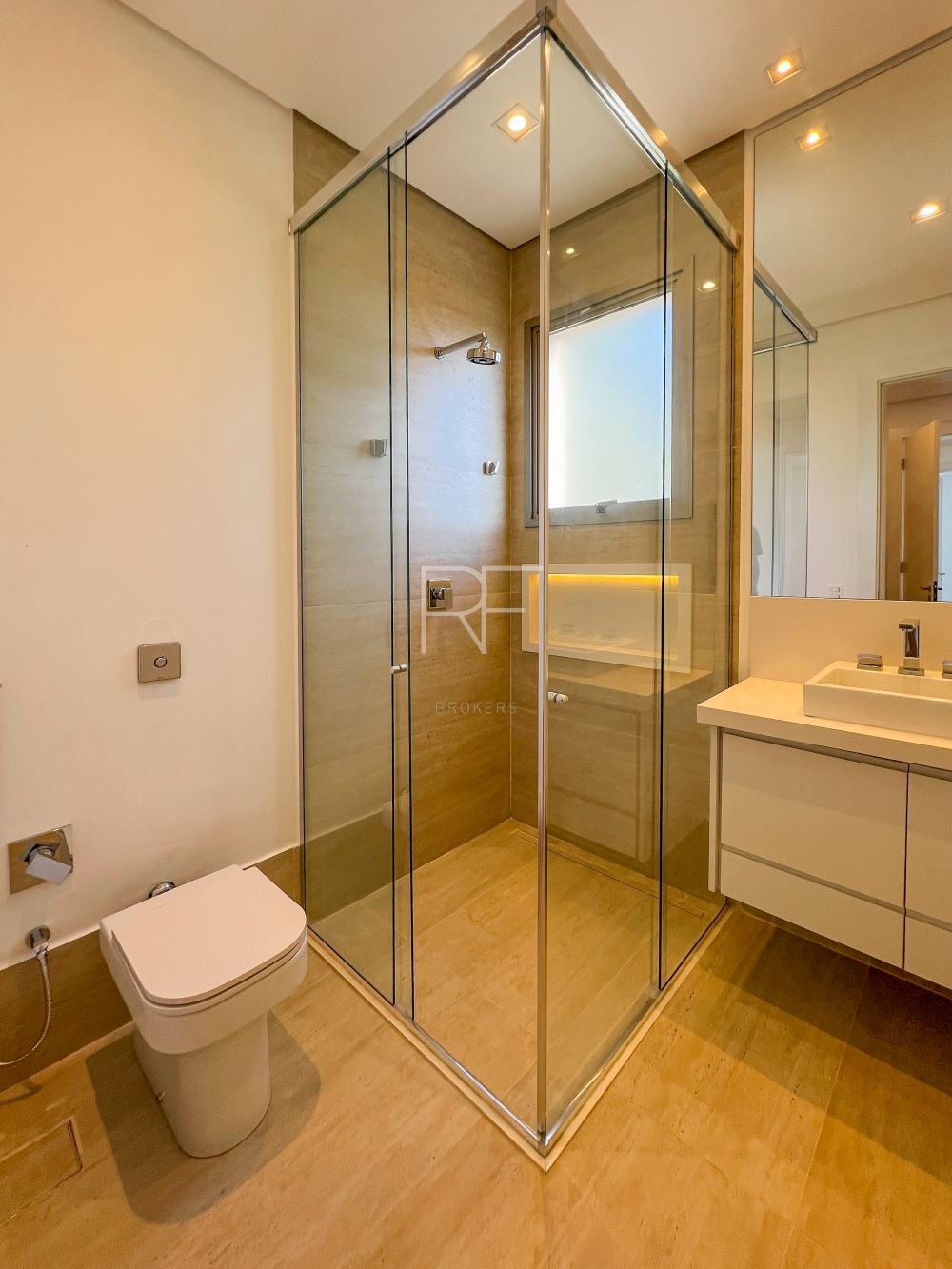 * São 3 pavimentos servidos por elevador, 4 suítes sendo 1 master com Hidro Pretty Jet automatizada, bancada em QUARTZO BRANCO, 2 closets Sr. e Sra., e sala íntima. Banheiros com metais Deca, repletos de Armários. Sala íntima, Escritório, Lavabo com cuba esculpida em Mármore Travertino Navona, Área social e escada em Travertino Navona, Revestimentos Decortiles, Roca e Castelatto. Lareira em Mármore Travertino Navona Área íntima em assoalho Cumaru e Esquadrias de Alumínio linha Eurotop