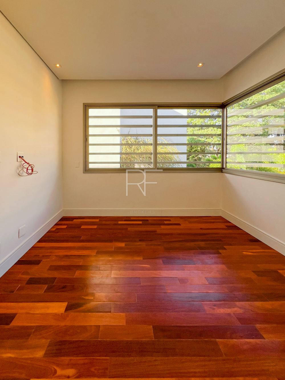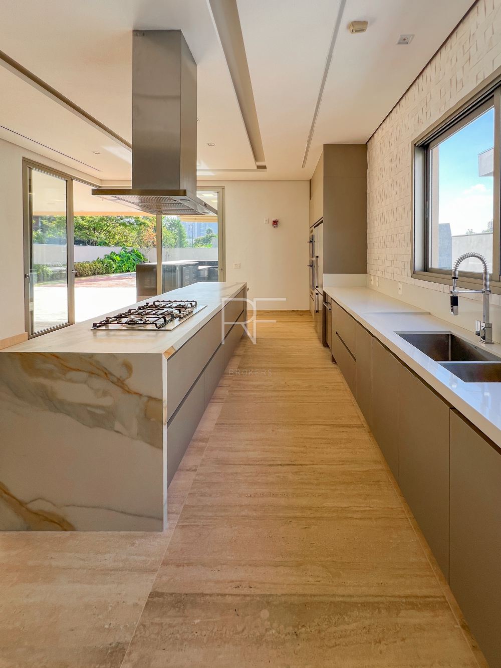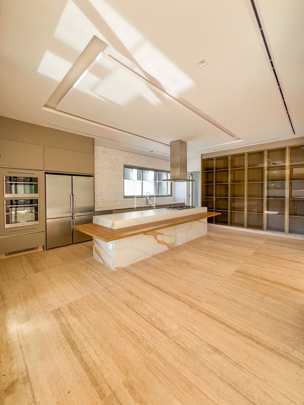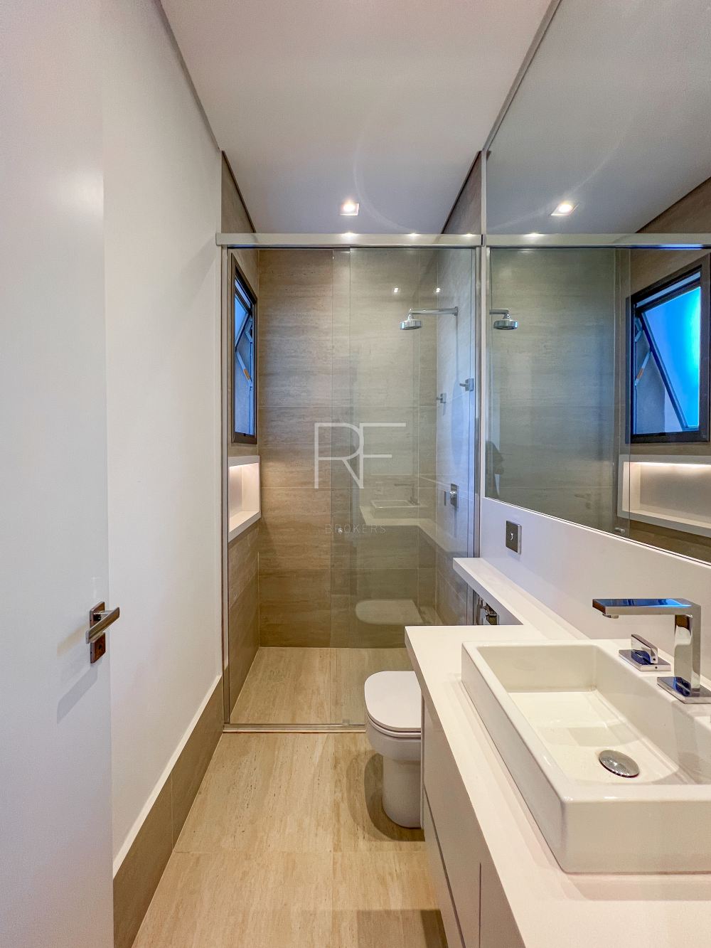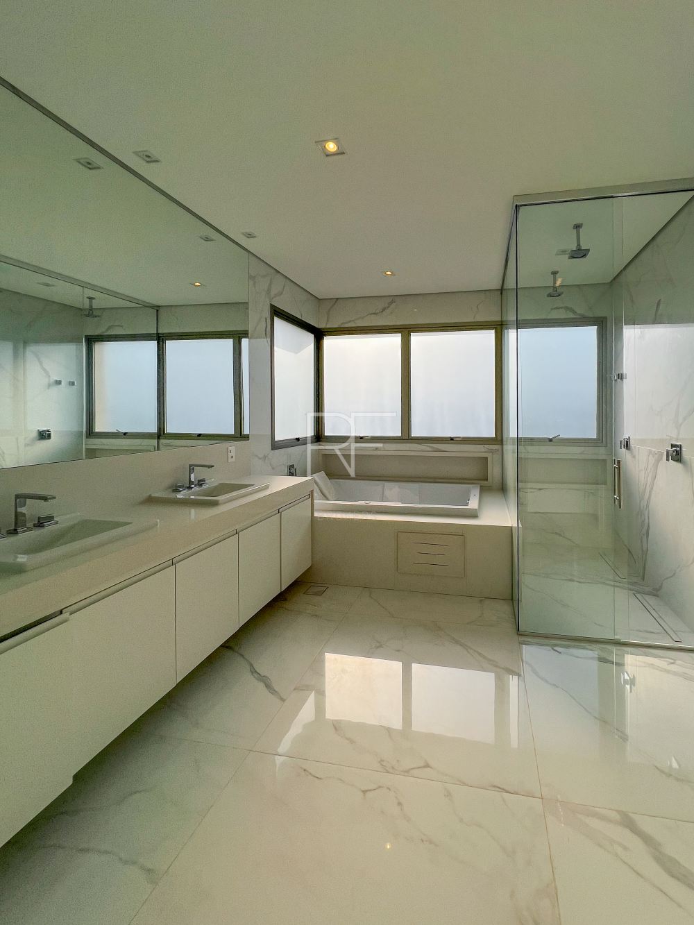 * São 3 pavimentos servidos por elevador, 4 suítes sendo 1 master com Hidro Pretty Jet automatizada, bancada em QUARTZO BRANCO, 2 closets Sr. e Sra., e sala íntima. Banheiros com metais Deca, repletos de Armários. Sala íntima, Escritório, Lavabo com cuba esculpida em Mármore Travertino Navona, Área social e escada em Travertino Navona, Revestimentos Decortiles, Roca e Castelatto. Lareira em Mármore Travertino Navona Área íntima em assoalho Cumaru e Esquadrias de Alumínio linha Eurotop