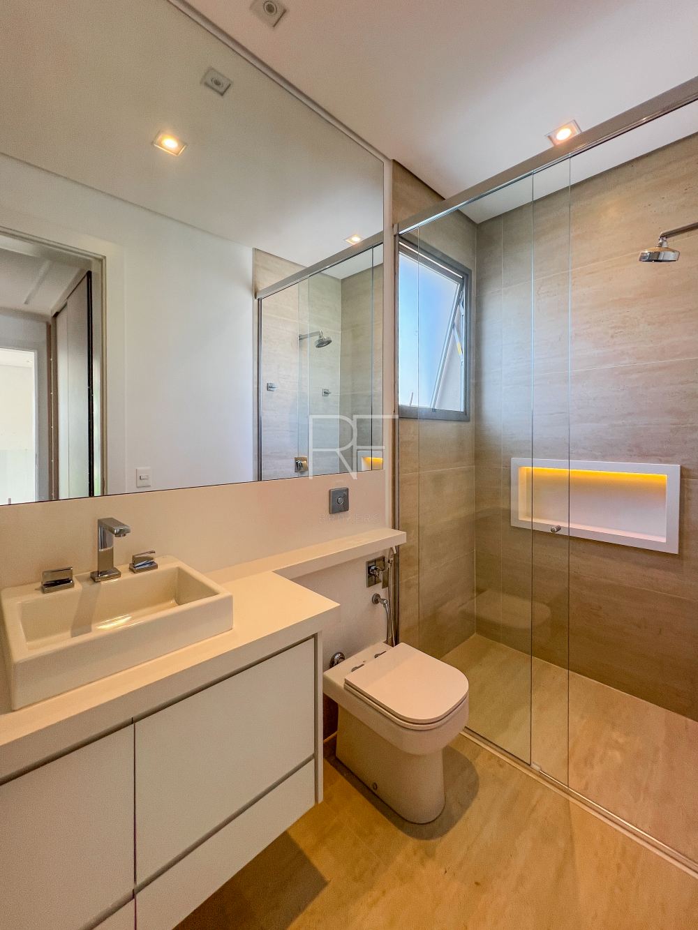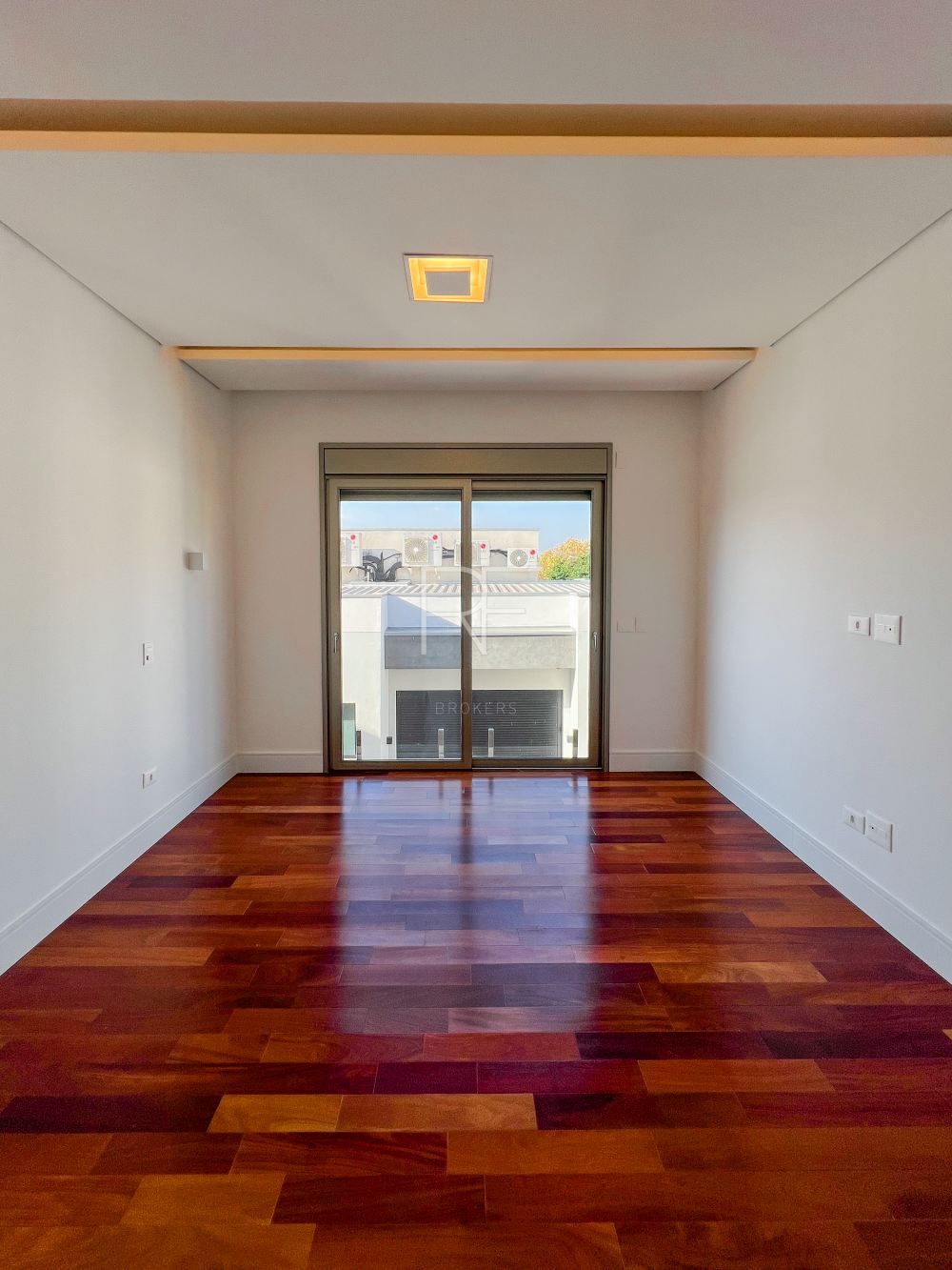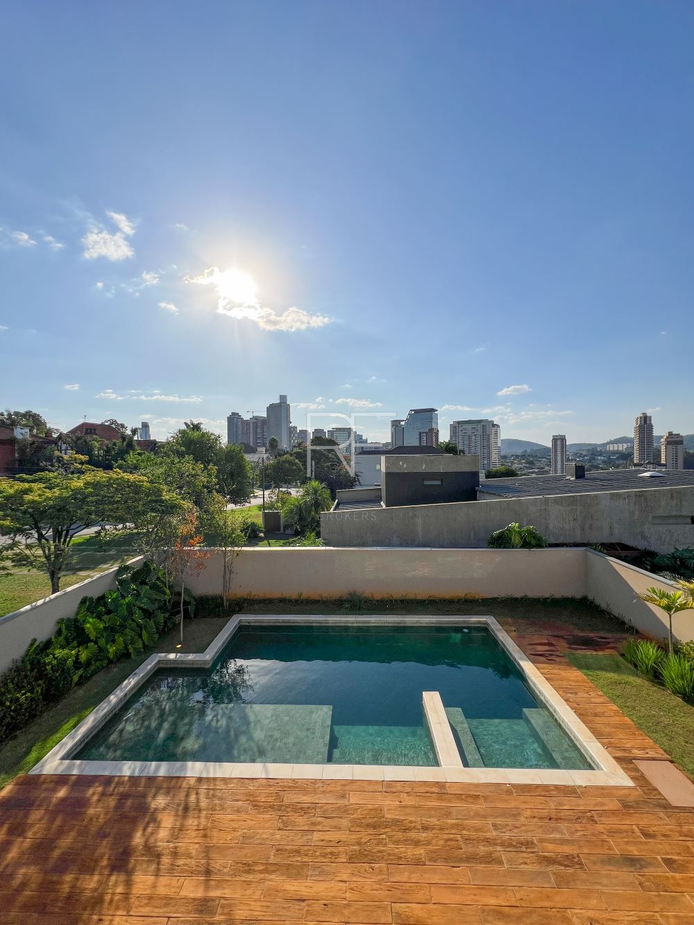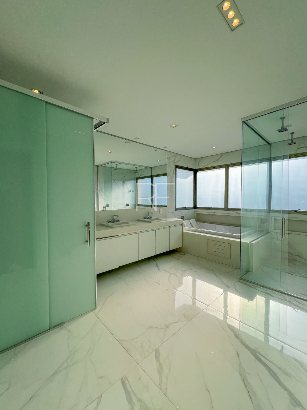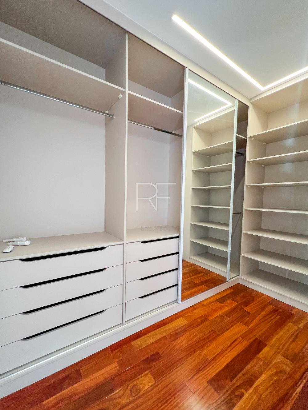 * São 3 pavimentos servidos por elevador, 4 suítes sendo 1 master com Hidro Pretty Jet automatizada, bancada em QUARTZO BRANCO, 2 closets Sr. e Sra., e sala íntima. Banheiros com metais Deca, repletos de Armários. Sala íntima, Escritório, Lavabo com cuba esculpida em Mármore Travertino Navona, Área social e escada em Travertino Navona, Revestimentos Decortiles, Roca e Castelatto. Lareira em Mármore Travertino Navona Área íntima em assoalho Cumaru e Esquadrias de Alumínio linha Eurotop