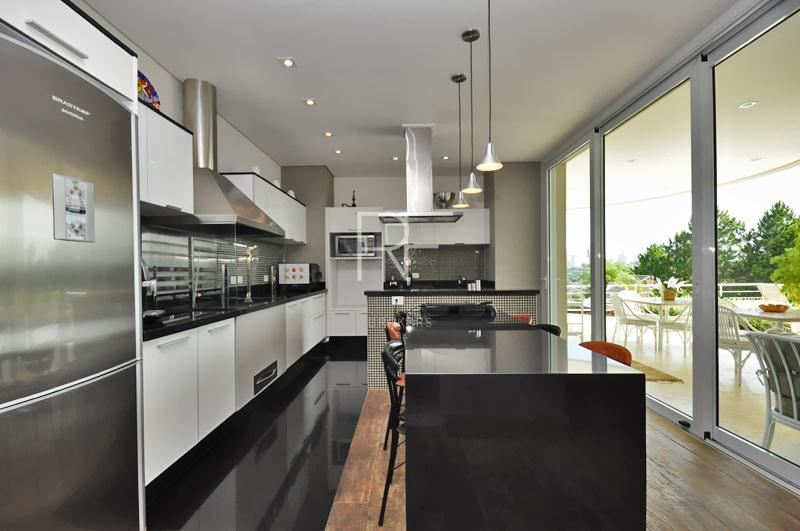 Duas cozinhas... A principal espaçosa com despensa tem acesso direto à garagem, à lavanderia, e a segunda cozinha! Sim, uma cozinha gourmet voltada para a varanda com churrasqueira, forno de pizza, cooktop e decoração despojada.
