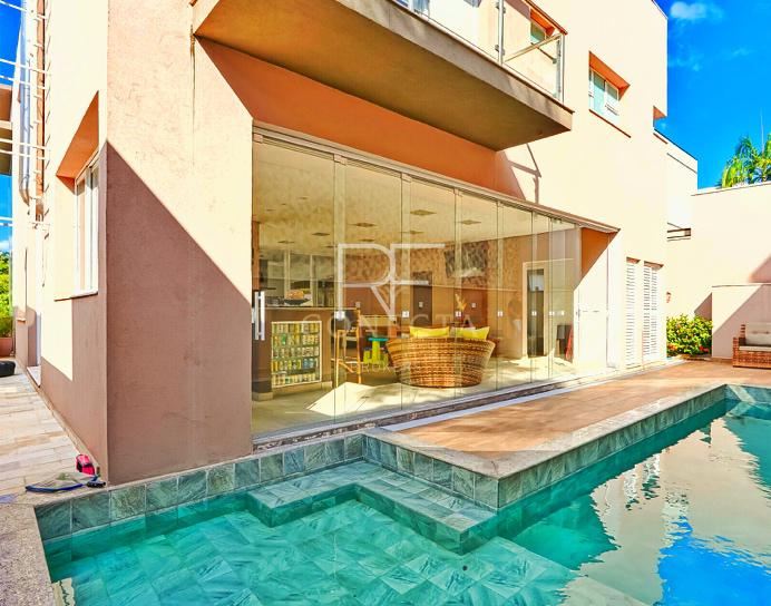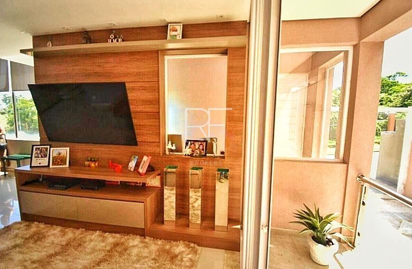 Living com lareira, pé direito duplo, painéis de vidro que proporcionam muita claridade a casa .