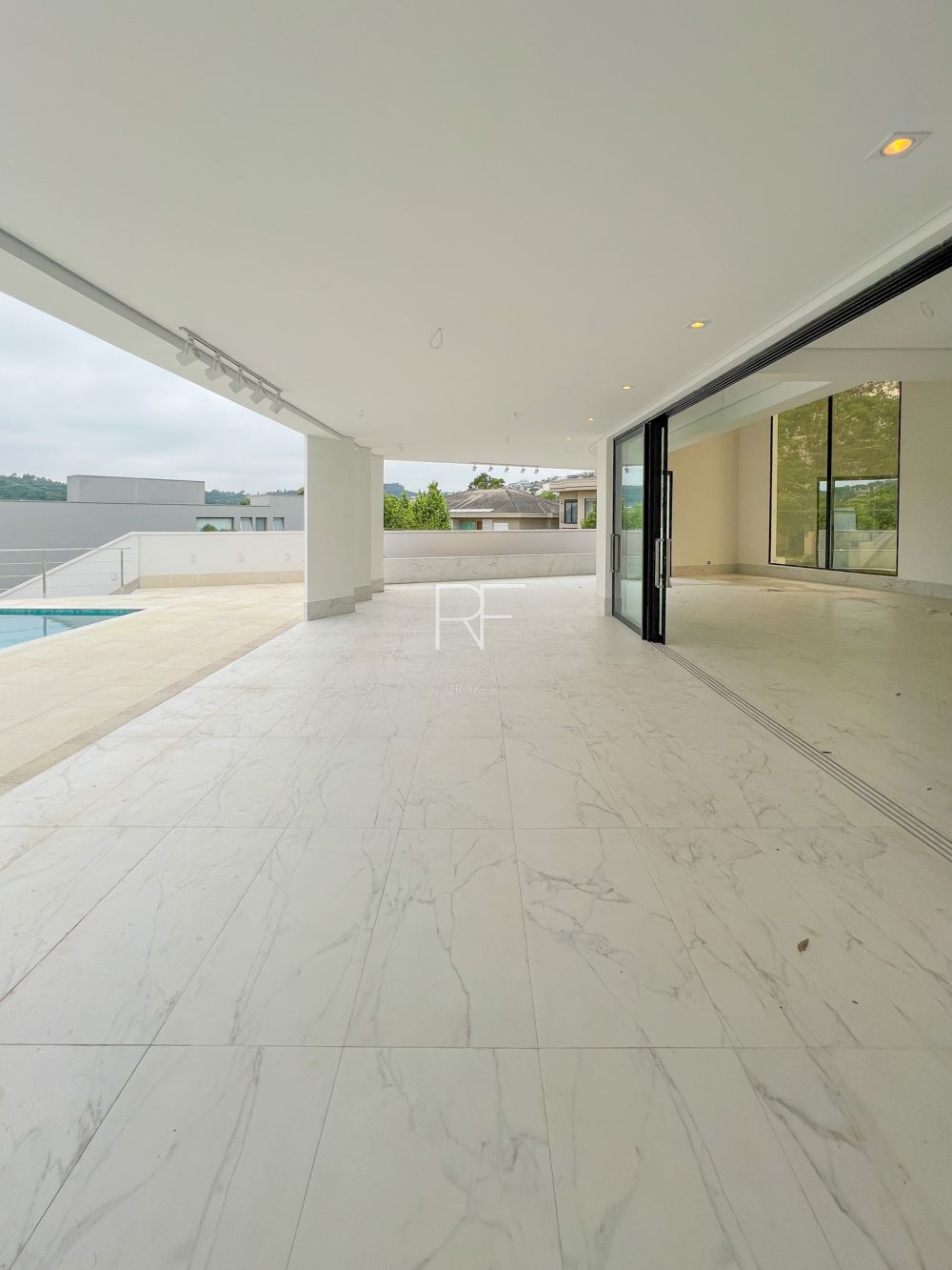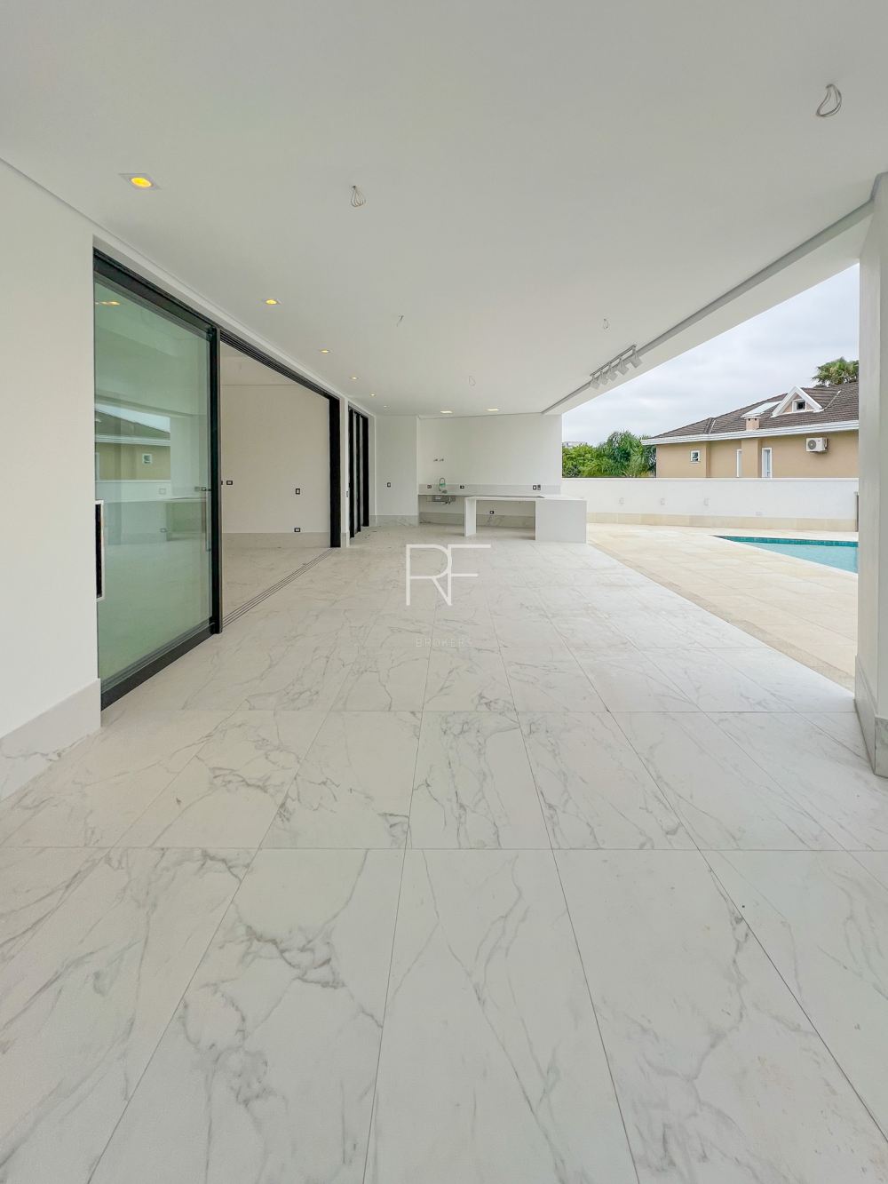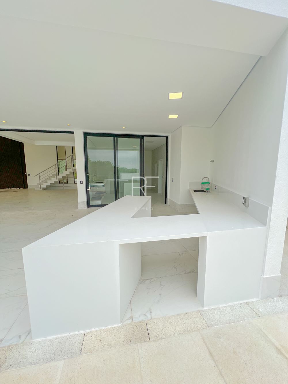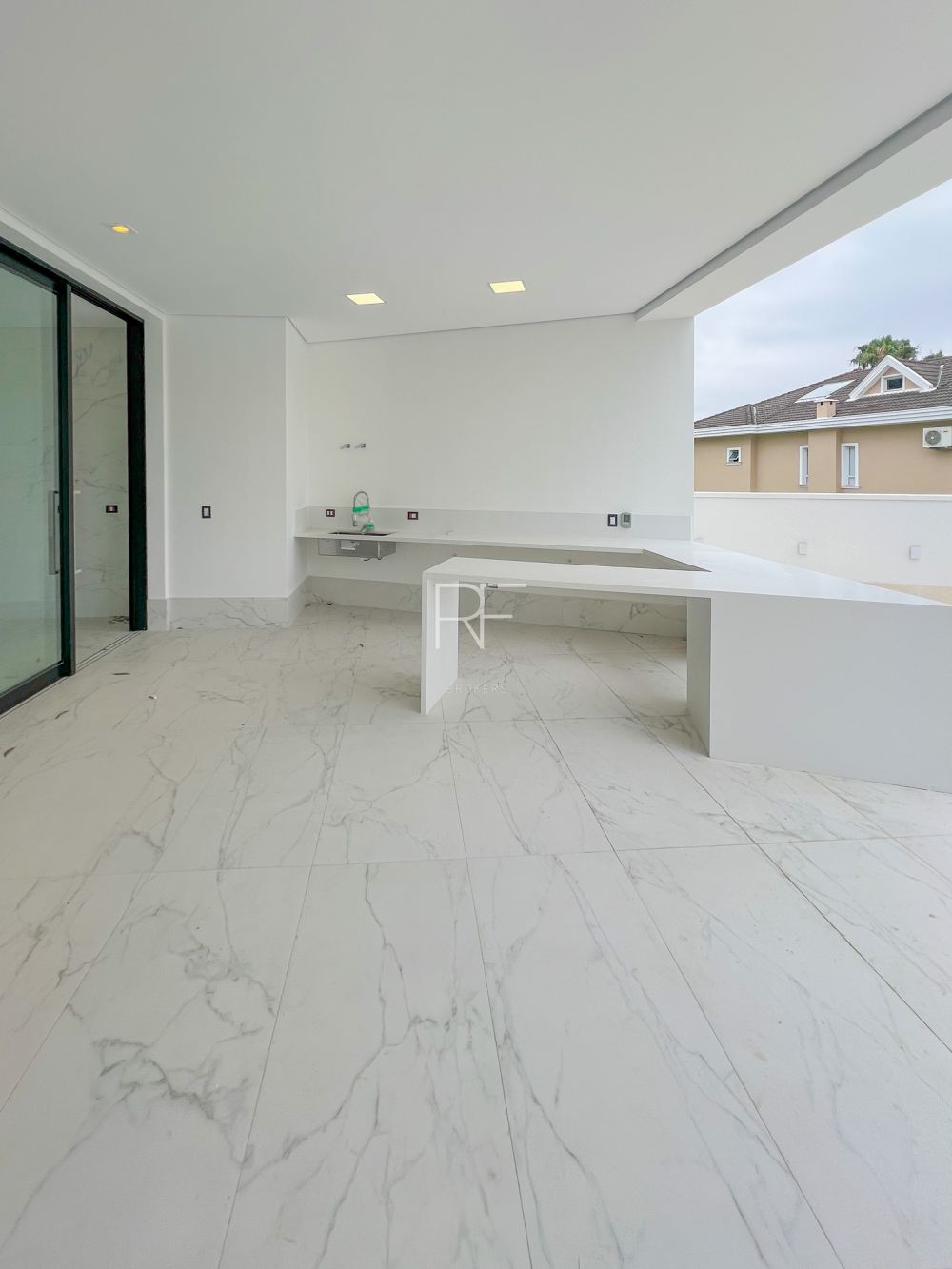 A cozinha ampla possui uma porta de correr que se abre totalmente, integrando-se à área gourmet.