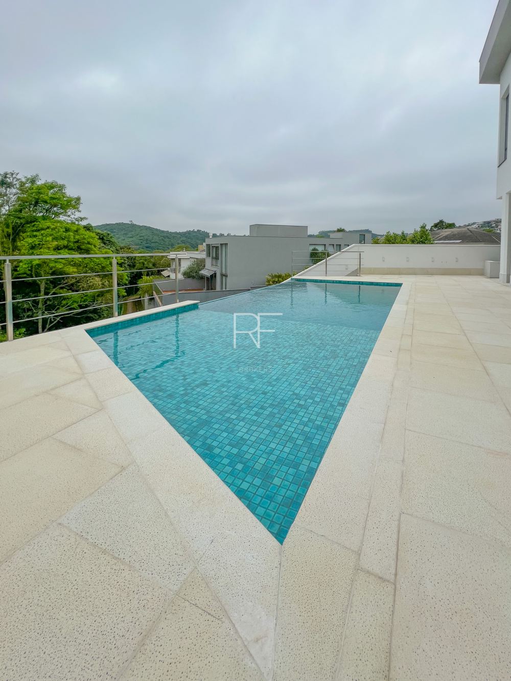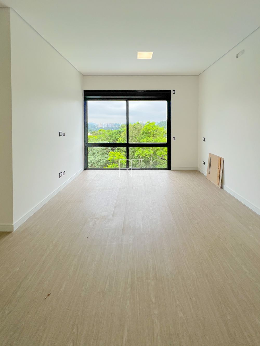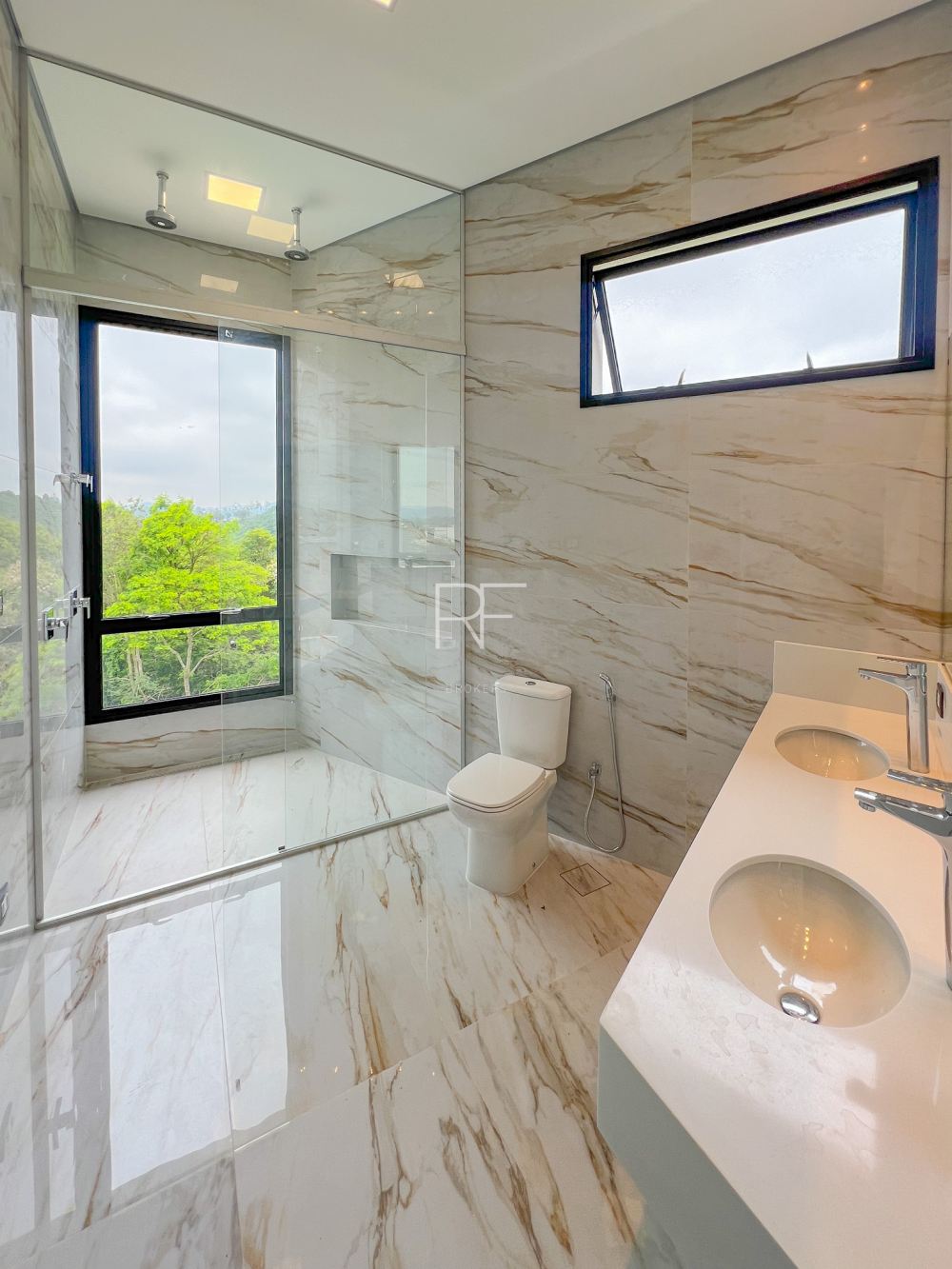 Há 4 suítes, sendo 3 com closets, um escritório, e salas integradas.