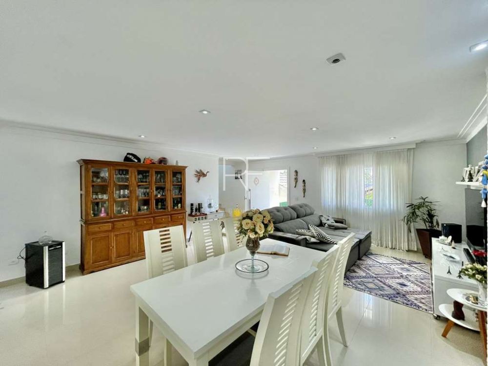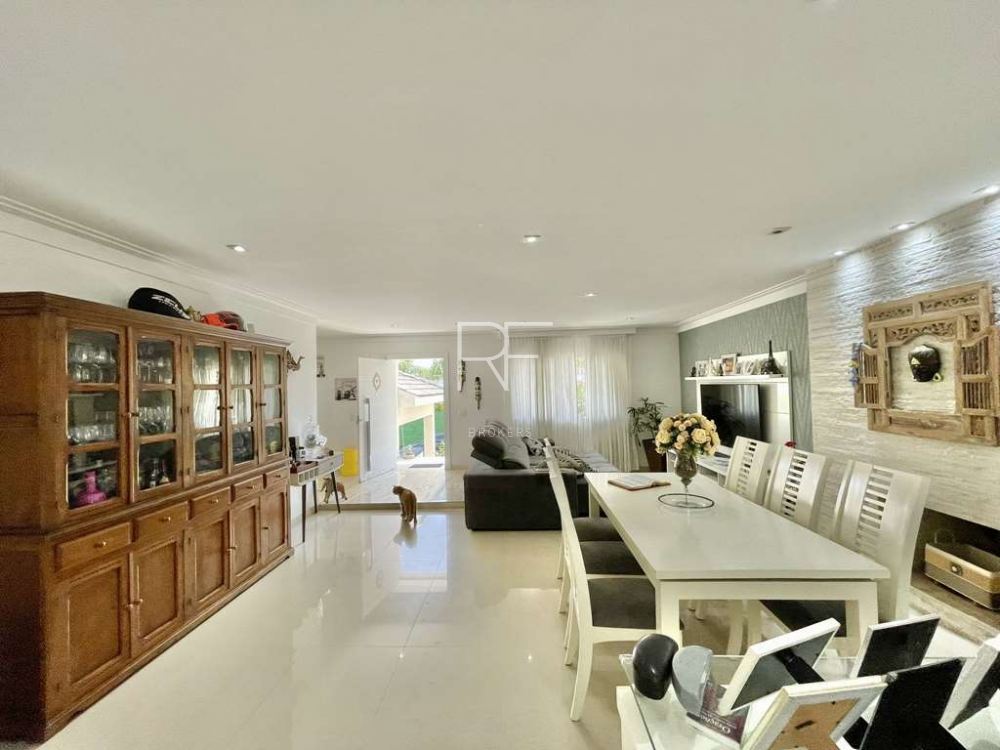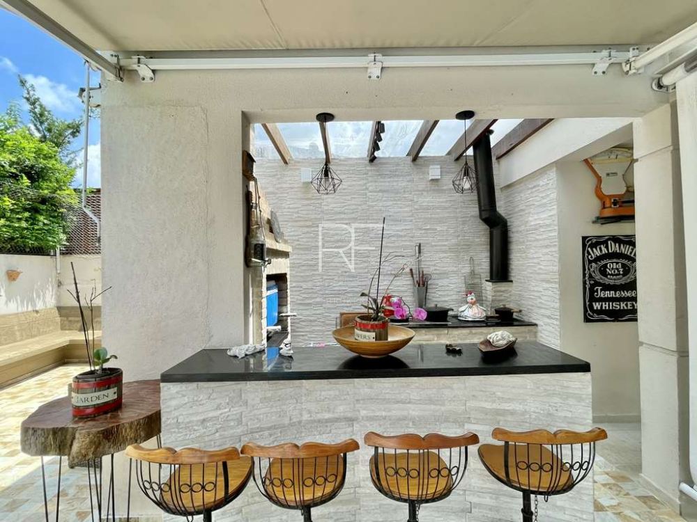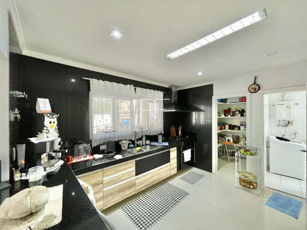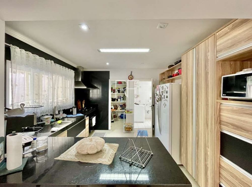 Cozinha integrada com sala de almoço, repleta de armários planejados, bancada de resina em “L”, ilha com fogão 5 bocas, coifa inox, 2 cubas inox e despensa.