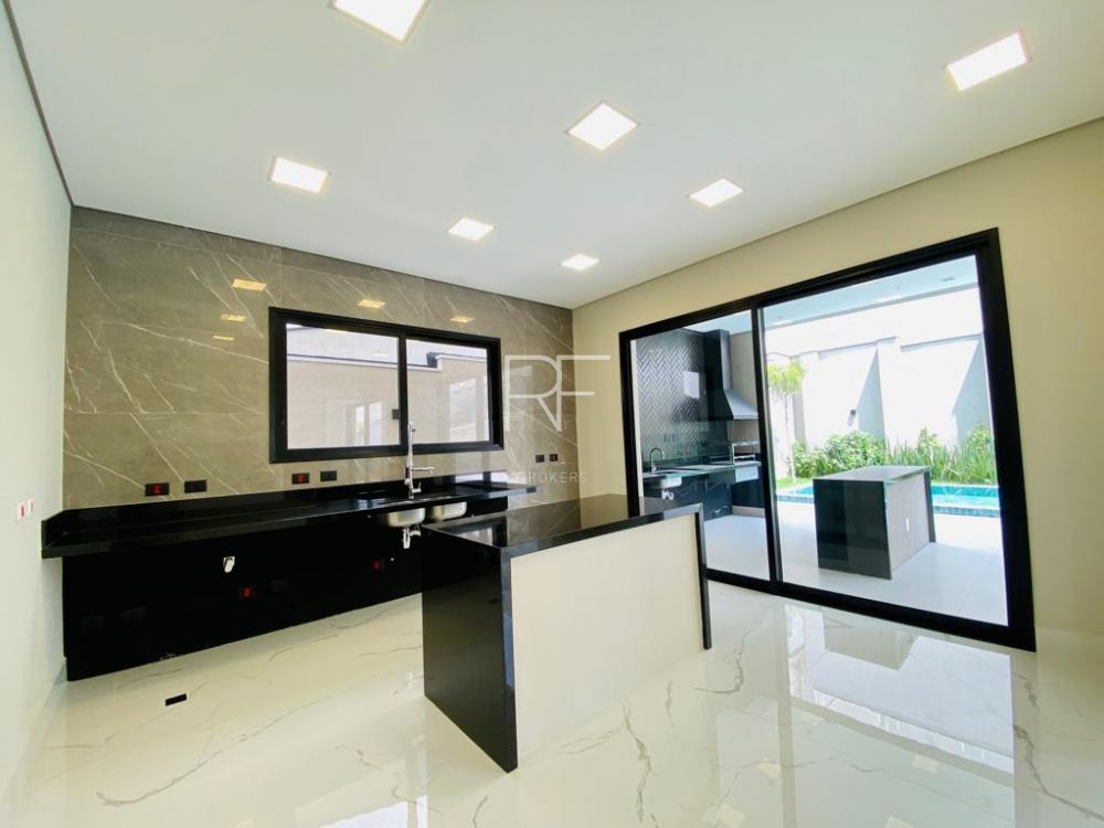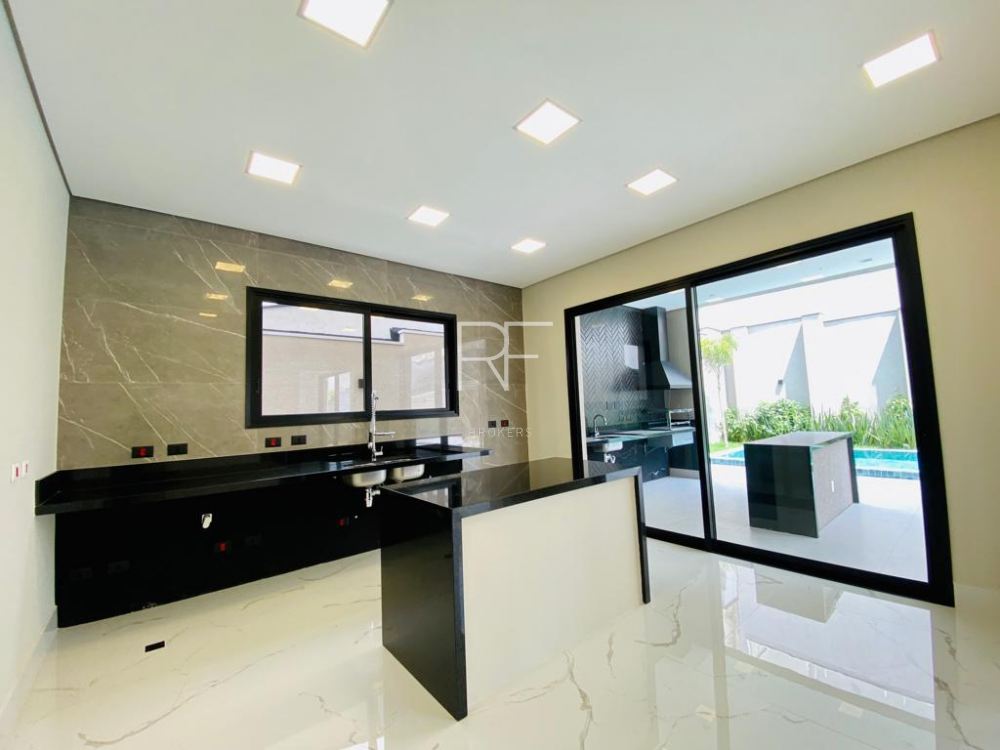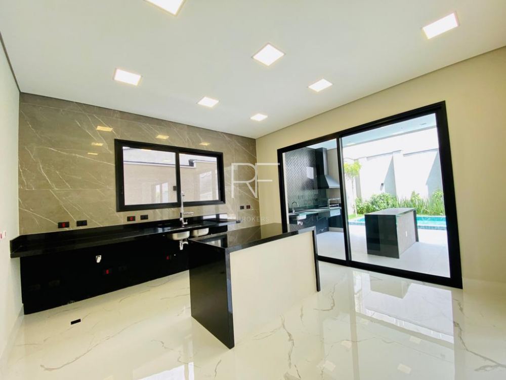 Cozinha ampla com ilha central, e living integrados a área gourmet com churrasqueira, coifa , pia com bancada de apoio e ilha central que interage com a piscina e gramado e jardim formado por coqueiros