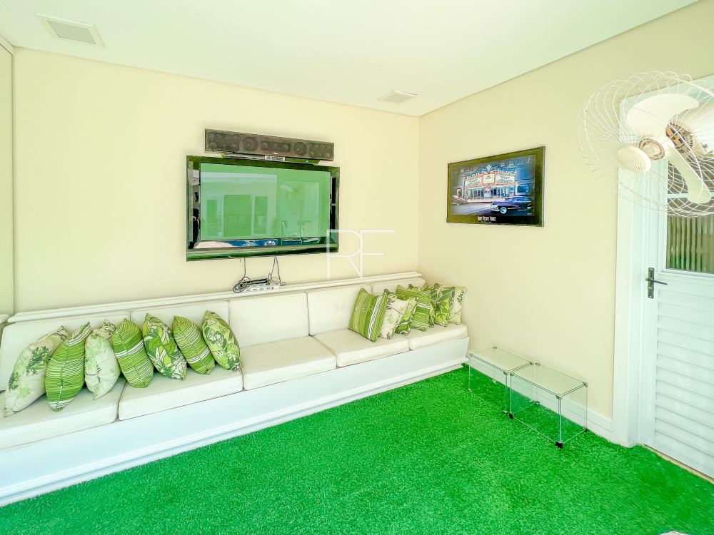 ampla sala de estar com home theater, lareira, lavabo e sala de jantar em mármore.