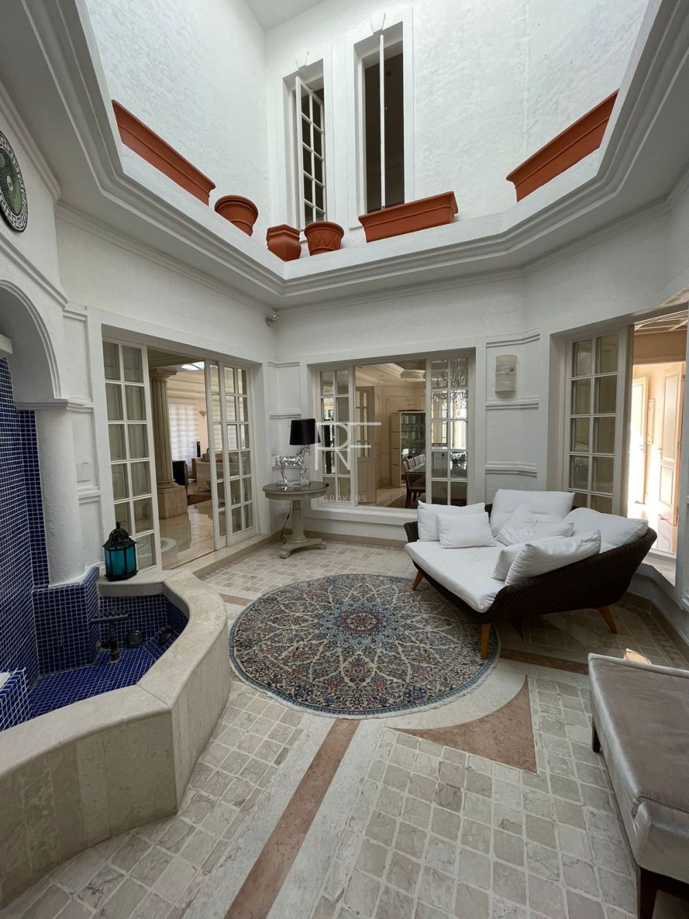 Jardim interno com fonte, Sala de estar com fonte, claraboia e pé direito duplo