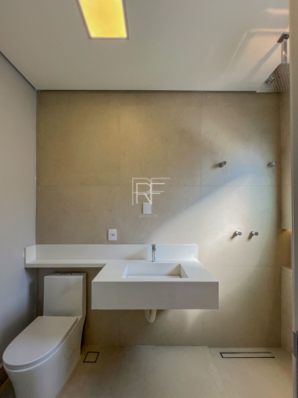 Um lavabo e um banheiro completo para atender o espaço de lazer externo.
