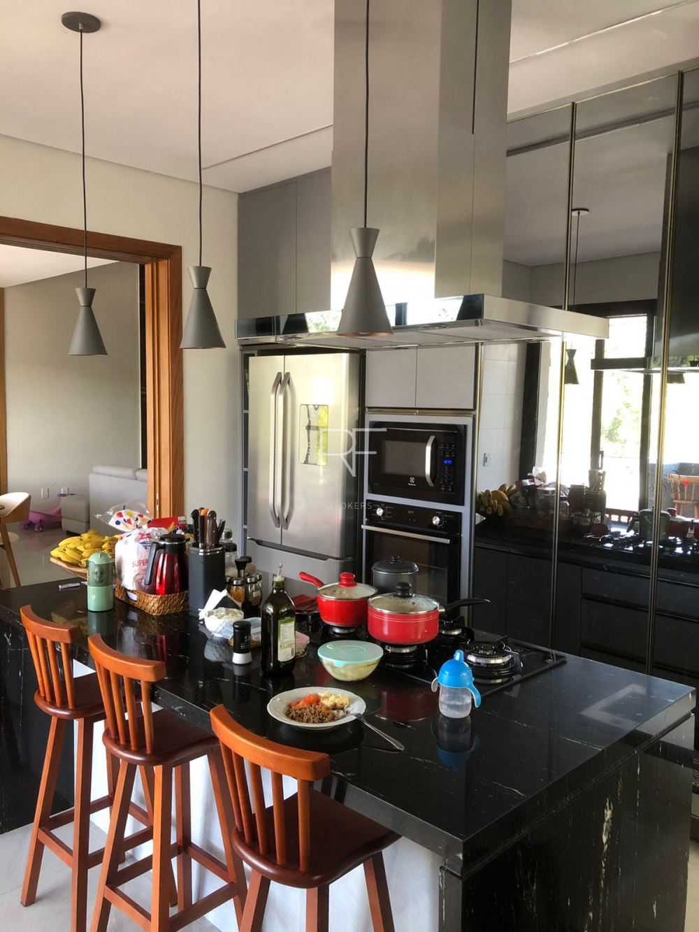 Cozinha com ilha e rica em marcenaria.