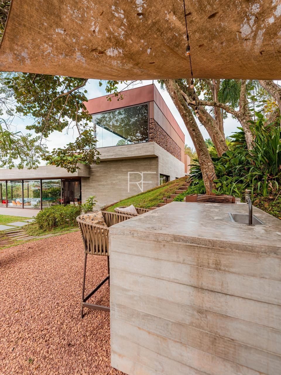 Área de churrasqueira sob um pequeno bosque e ao ar livre