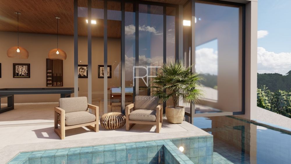 Área gourmet totalmente integrada com piscina. Piscina com borda infinita com vista voltada para mata. Sala de jogos com brinquedoteca, quadra poliesportiva sob pilares. No último piso inferior, será entregue no contrapiso.