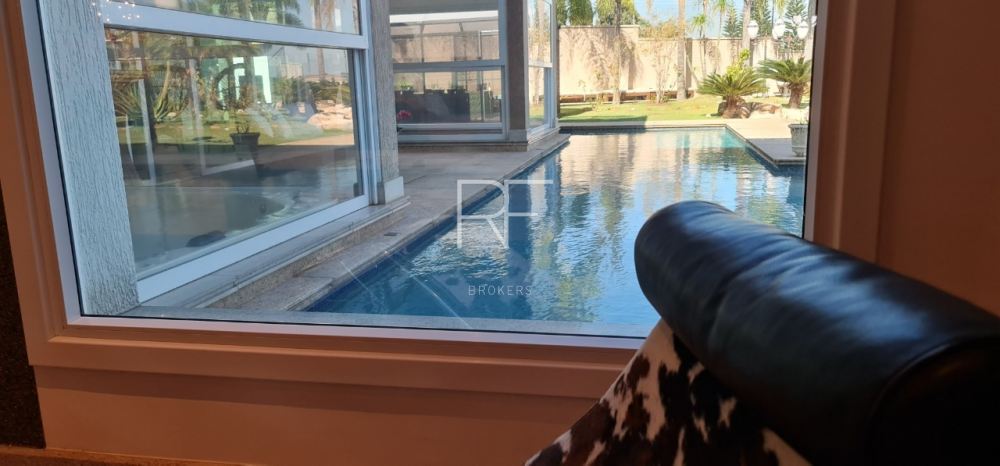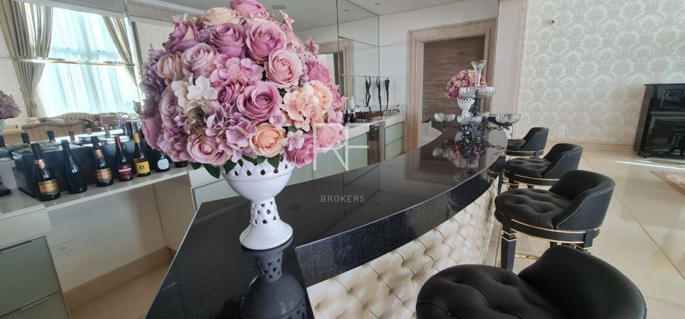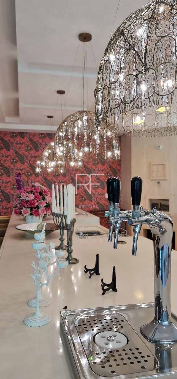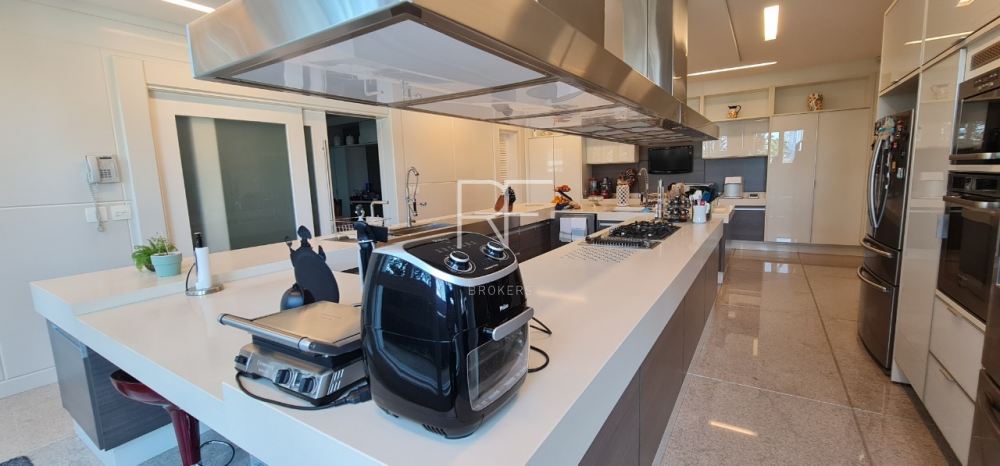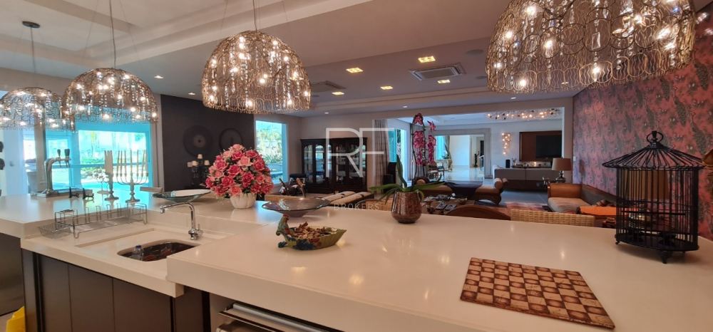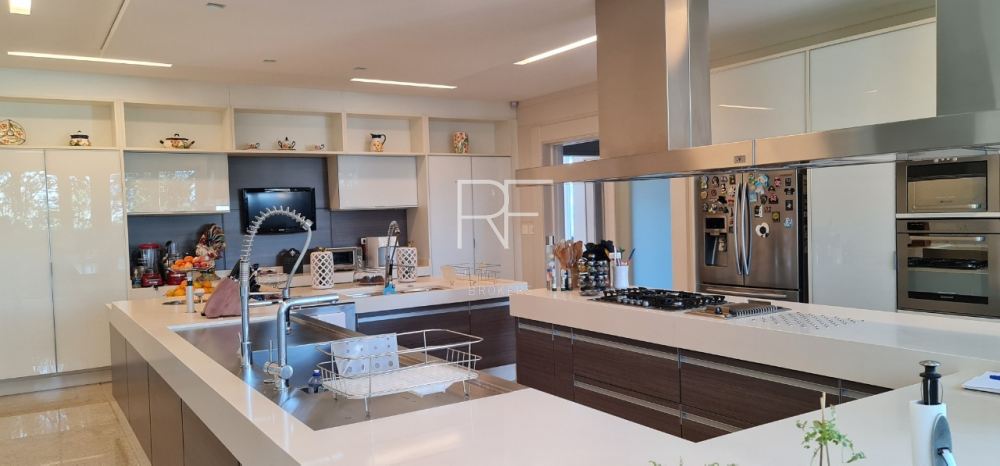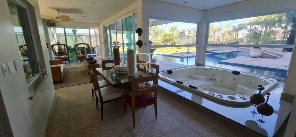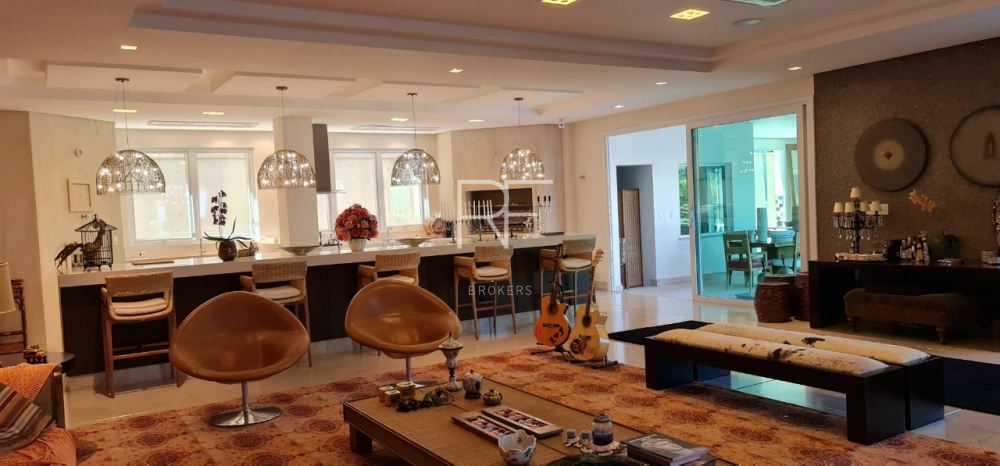 Living com pé direito duplo distribuído em dois ambientes, conectados com bar, sala para cristais com lareira, lavabo, escritório, sala de TV com 2 lavabos, sala de jantar ampla para 12 pessoas, copa para 12 pessoas, além do espaço gourmet para preparar sua pizza ou churrasco com amigos e familiares.