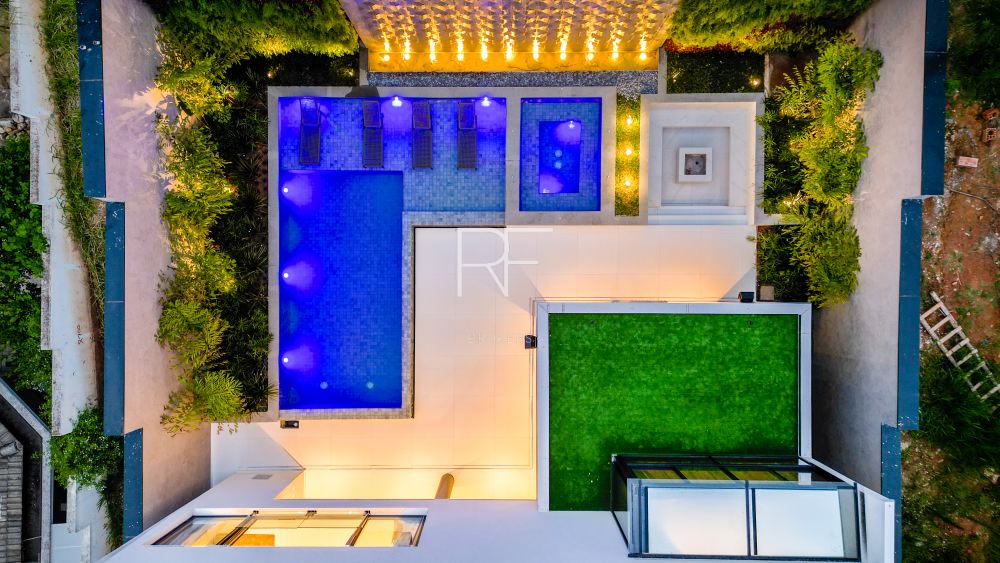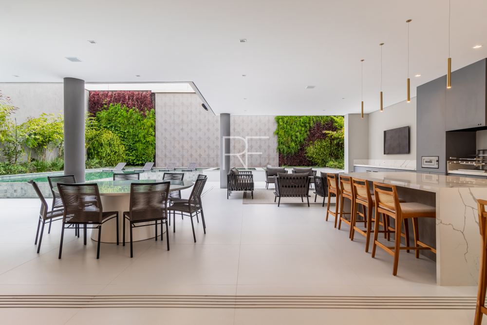 Seguindo para área gourmet é possível desfrutar de um ambiente amplo com piscina com cascata, Jardim vertical, tocheiro e tudo que você precisa para receber e encantar seus convidados. Além de um home cinema com acesso para área gourmet.