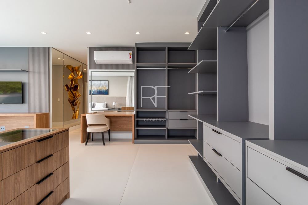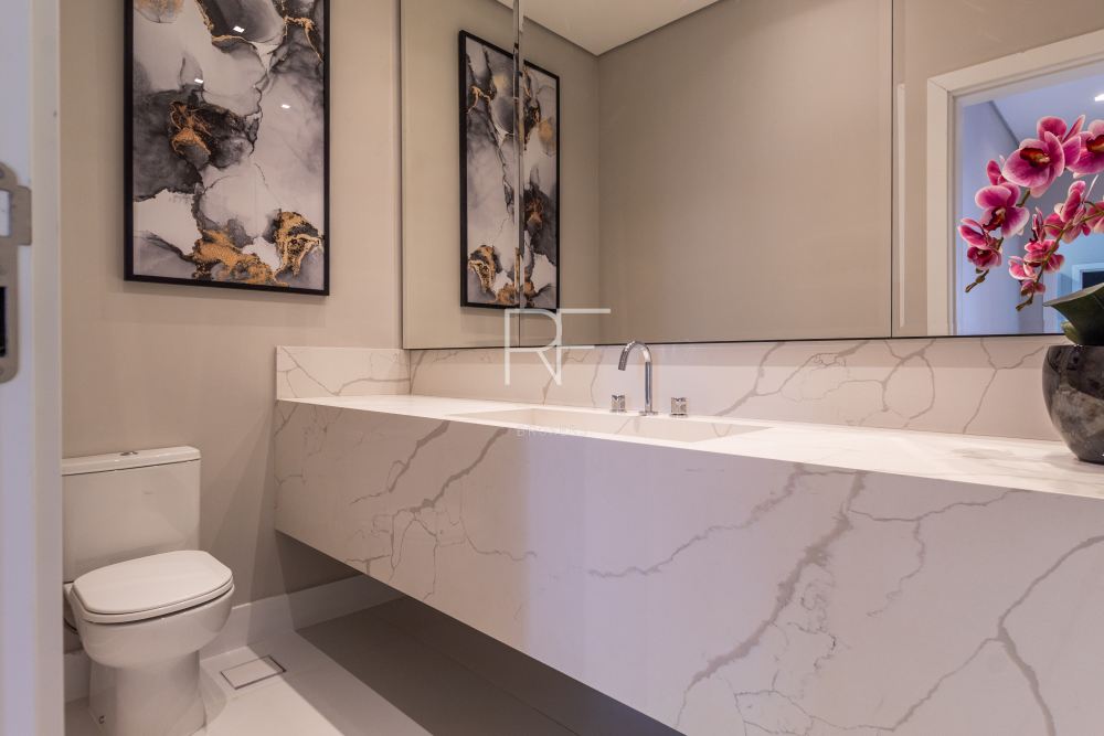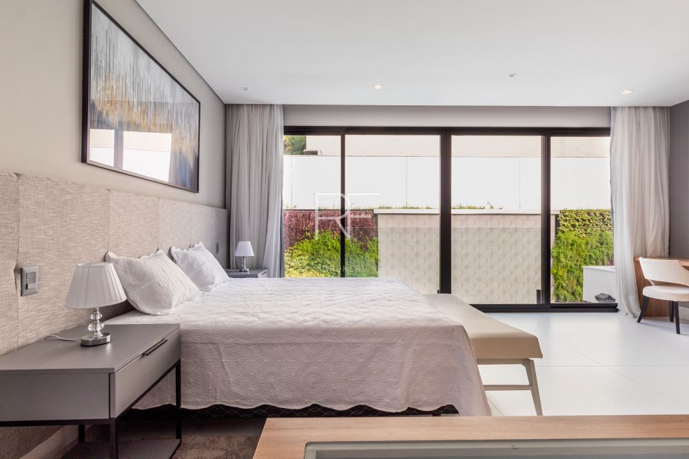 O pavimento superior possui 5 suítes sendo 1 master com closet walk-in e banheira com vista para o jardim vertical tornando os momentos de relaxamento e tranquilidade ainda melhores. Garagem com 6 vagas, escritório, dormitório de empregados com suíte no pavimento inferior. Imóvel será entregue mobiliado.