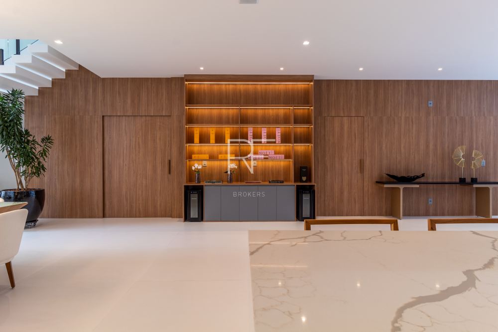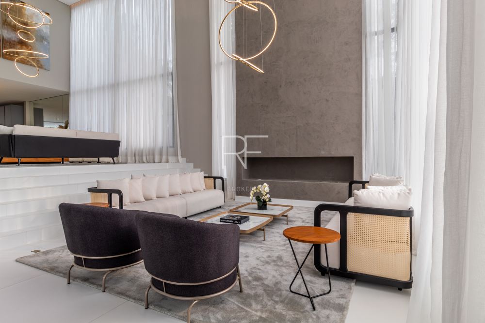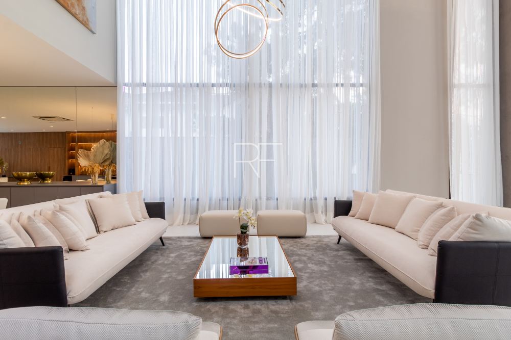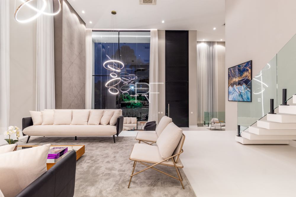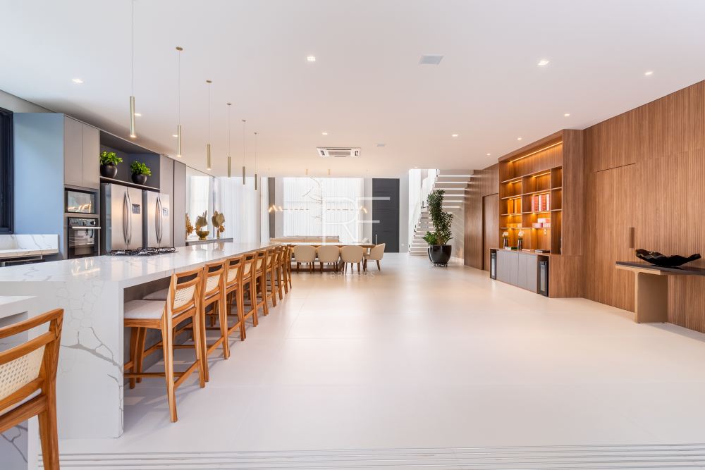 Ambientes integrados, amplos com decoração clean e luminosidade natural são sinônimos desta mansão. O living integrado conta com um jardim interno, pé direito duplo, mesa jantar para 12 pessoas e adega.