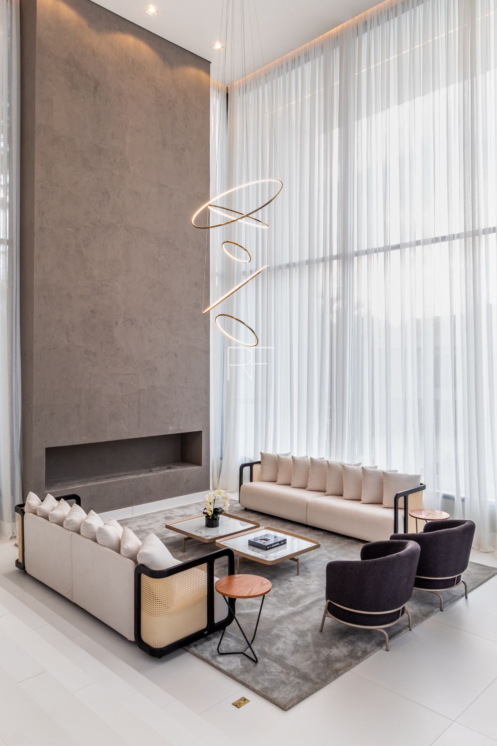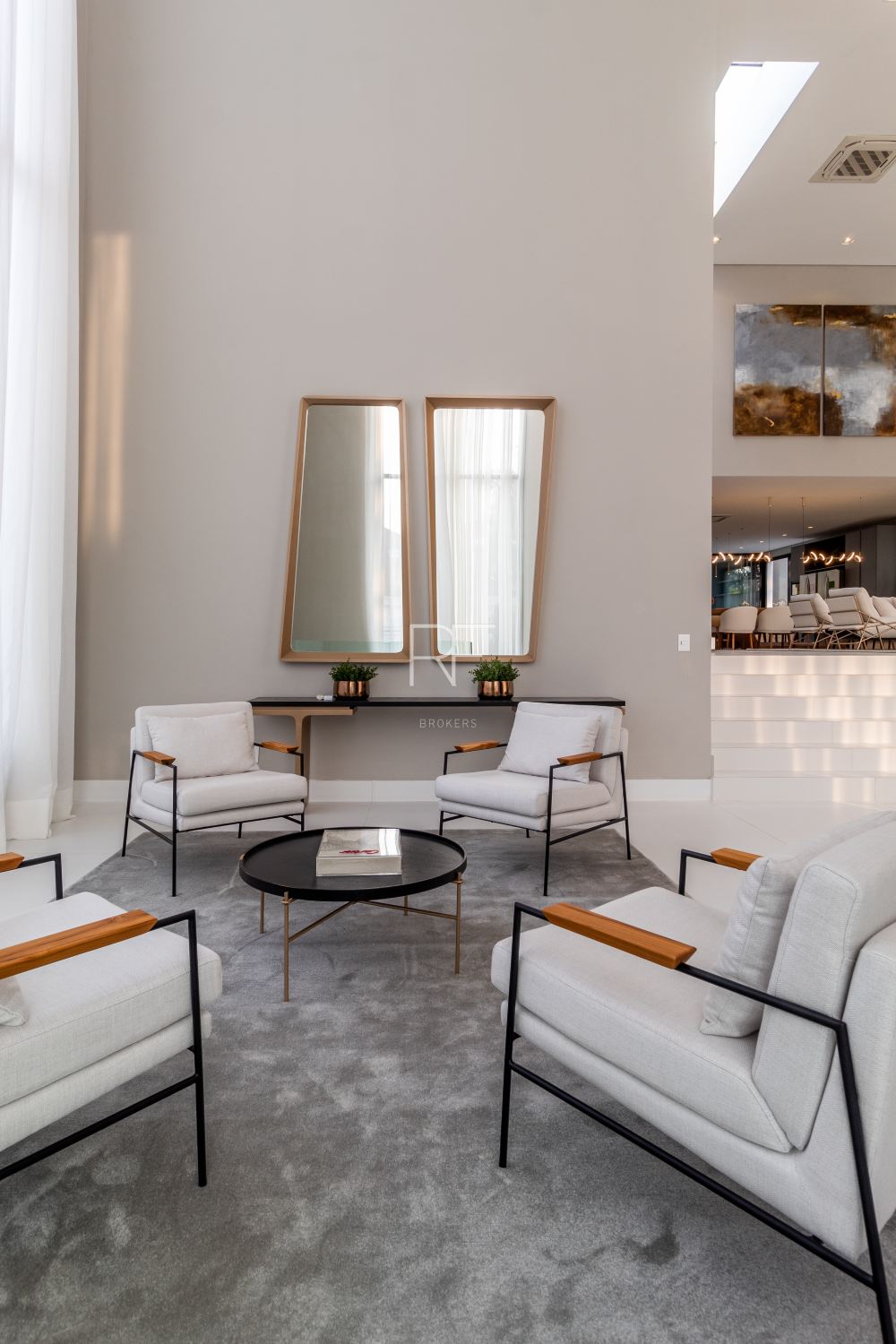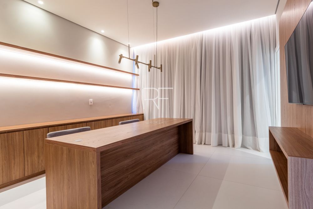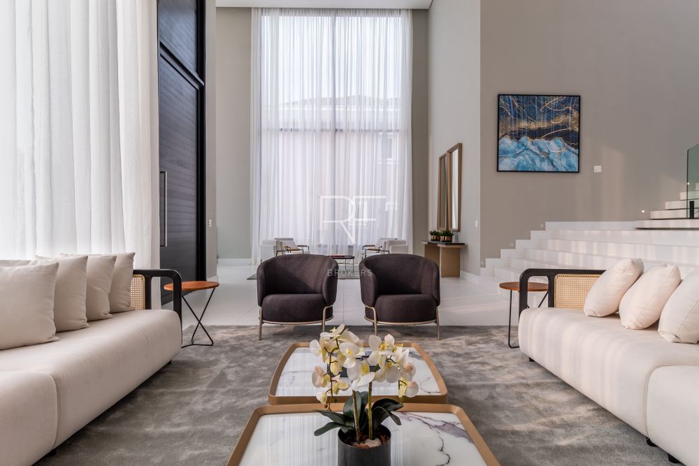 Ambientes integrados, amplos com decoração clean e luminosidade natural são sinônimos desta mansão. O living integrado conta com um jardim interno, pé direito duplo, mesa jantar para 12 pessoas e adega.