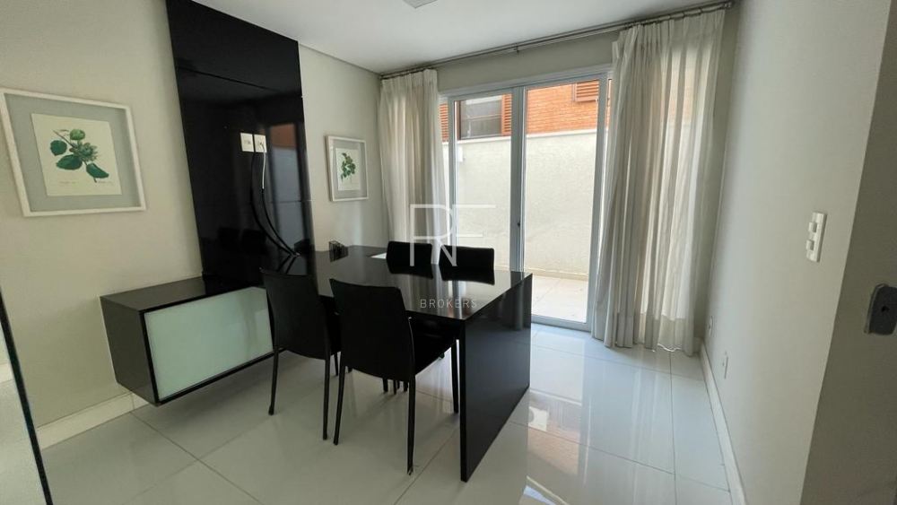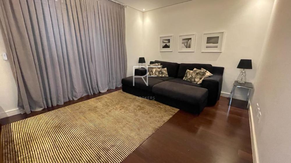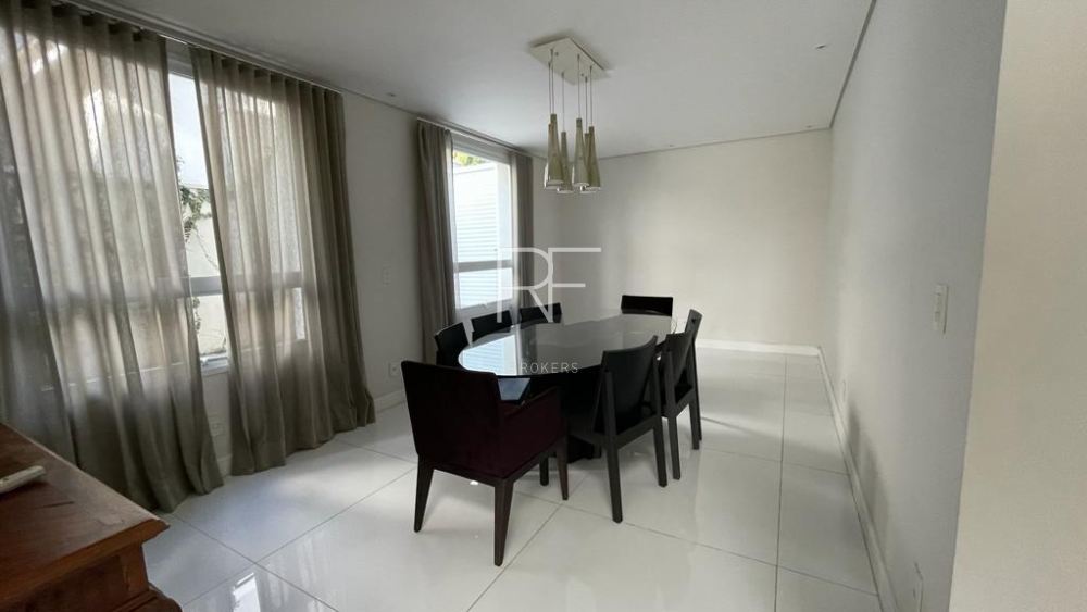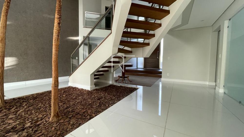 A residência tem pé direito duplo e muitas esquadrias de grandes formatos, que trazem muita iluminação natural e ambientes bem arejados.