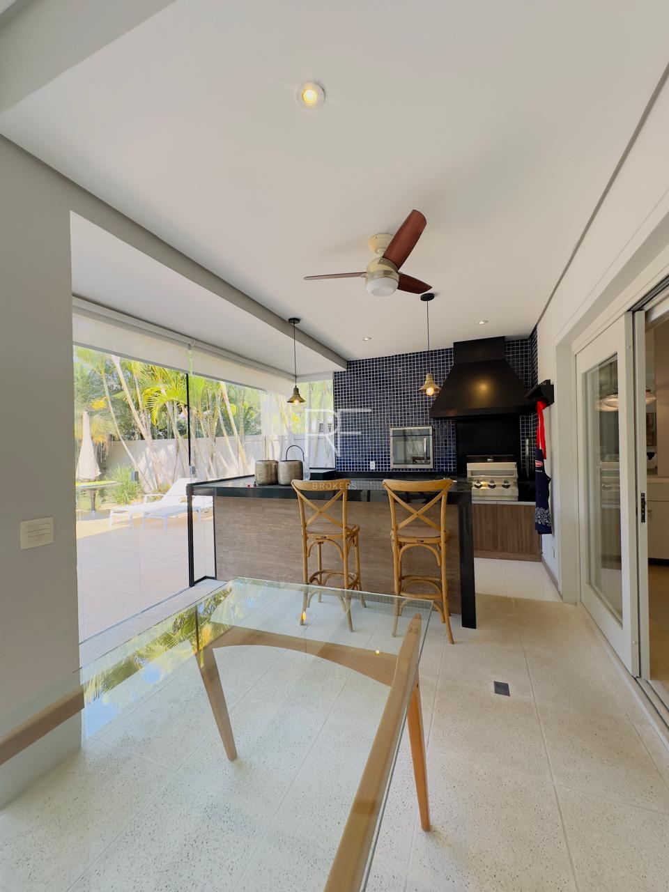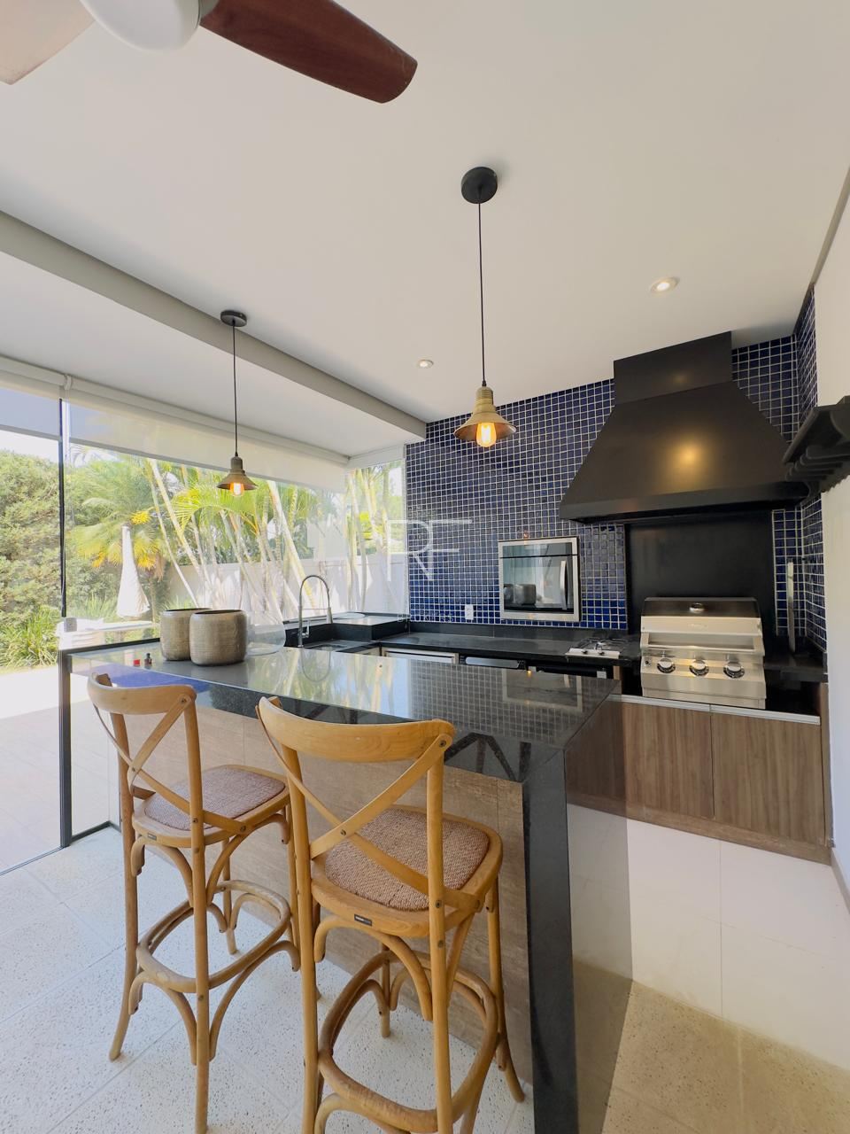 Área gourmet com churrasqueira, cooktop, adega, frigobar e forno elétrico.